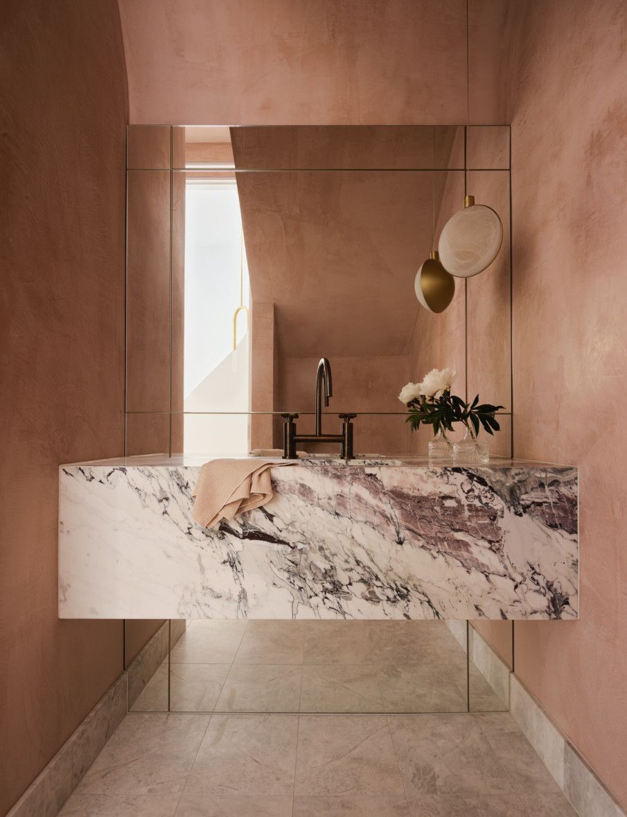 The powder room has been inserted just below the staircase - it's private, it's out of sight, and it just feels so luxurious, especially in a house of this size. It speaks to the entire design, which is overall modern but with a few classical touches that just bring it a little bit more depth. Furthermore, this space has a feminine energy - the Venetian plaster in pink shade was applied to both the ceiling and walls. The paneled mirror is a real feature as well as the beautiful pendant light from Spence & Lyda.