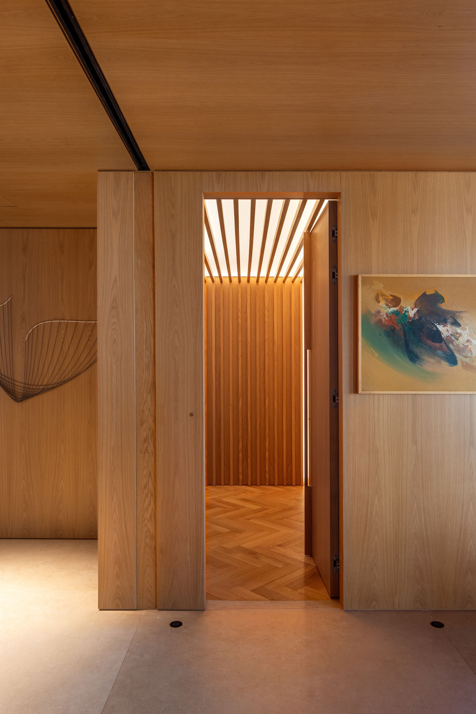 The wall surfaces are clad in American oak panels – the same finish as the ceiling – creating a uniform surface that wraps around the space and blends seamlessly with the cabinetry and doors leading to adjacent environments. The palette of natural materials enhances the welcoming atmosphere, while also providing a neutral base for the furniture and artwork.