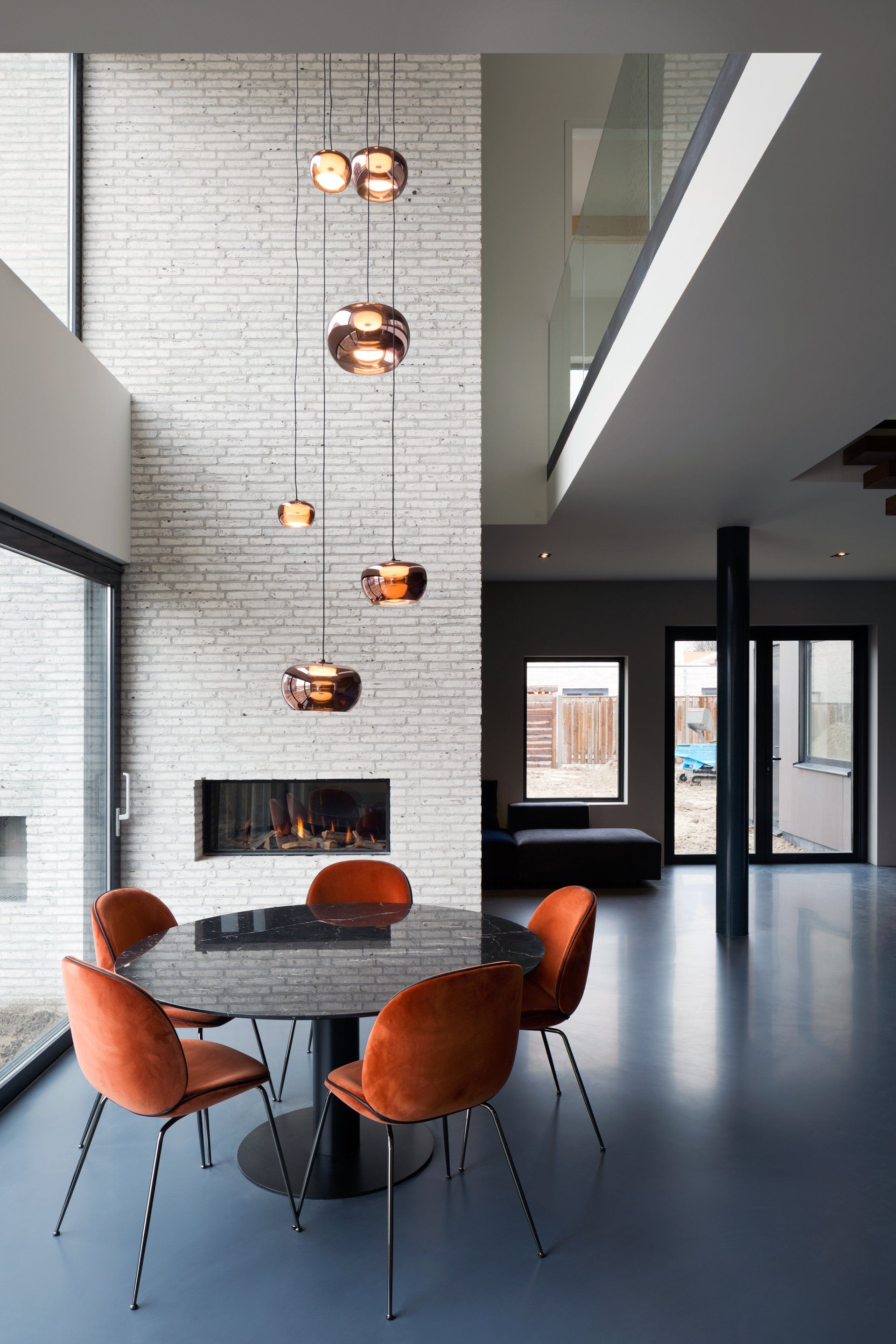 The house is situated at a new building site at the edge of Rotterdam, where it overlooks a typical Dutch polder landscape and where the skyline of the city centre is visible at the horizon. The landscape and beautiful view can be seen from the spacious and naturally exposed kitchen which extends all the way up to the roof, through the wide vide. However, the living room is completely different: a dim lighted room for more quiet and intimate moments with the family. The chimney separates the rooms, functions as a natural backbone throughout the house and also connects the garden area to the living area with its in- and outside fireplace.