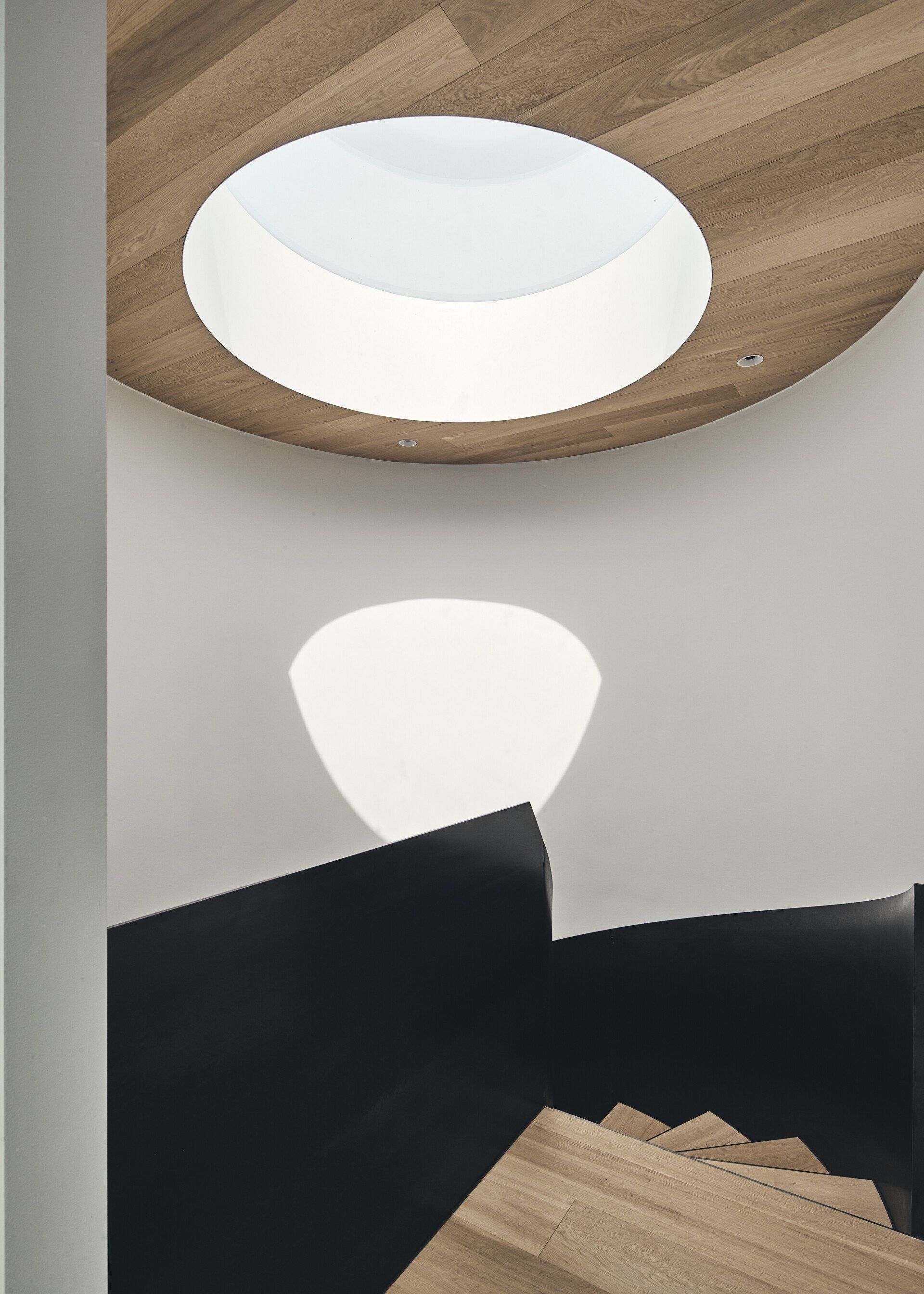 Non-spaces of circulation are redefined into a delineated linear programmatic pure white ‘strip’ traversing the entire length of the site envelope. Double height spaces, interlocking volumes and visual links are connected through Art. Art informs architecture and program, art becomes an architectural element, art now has utility.
