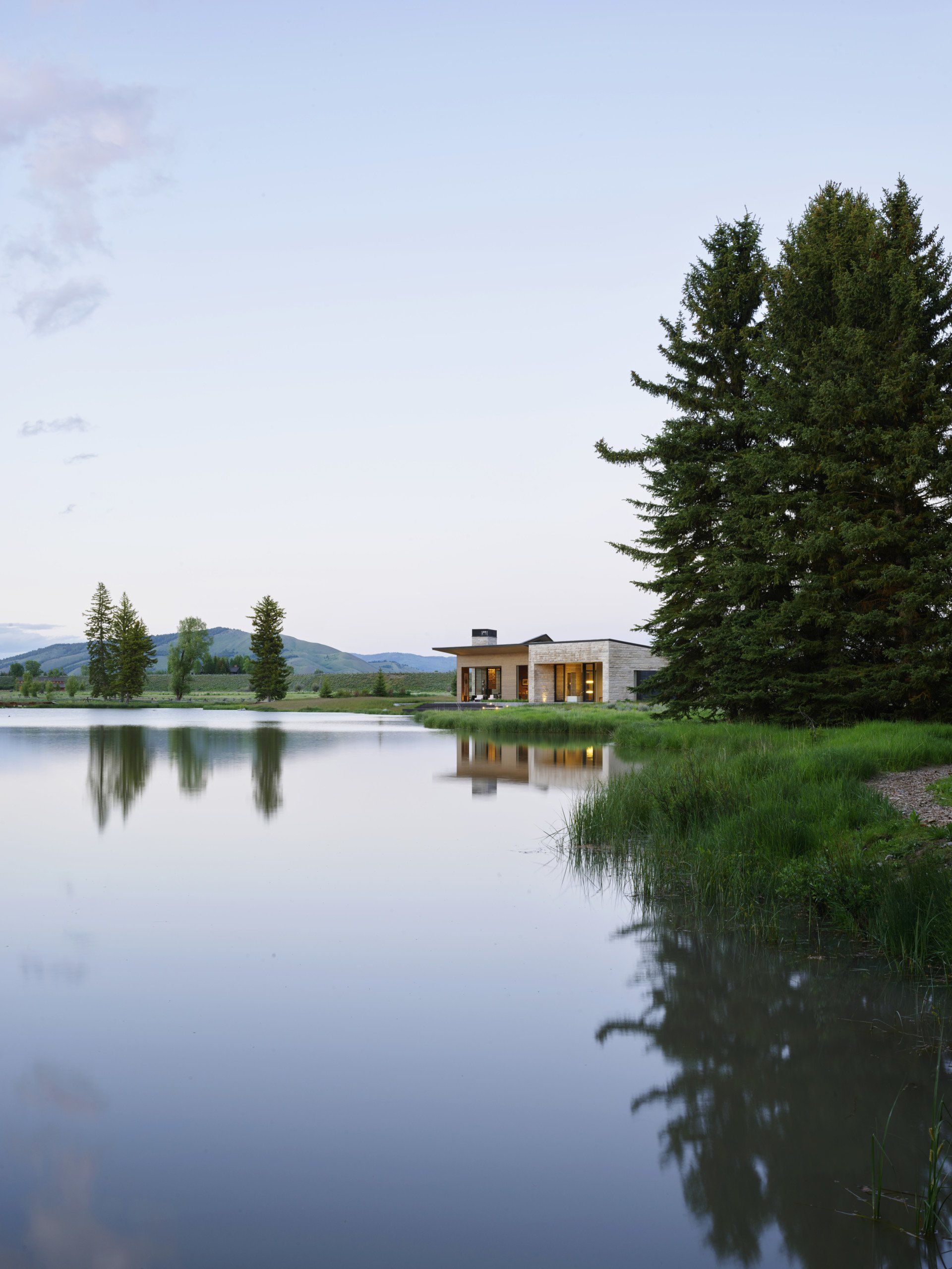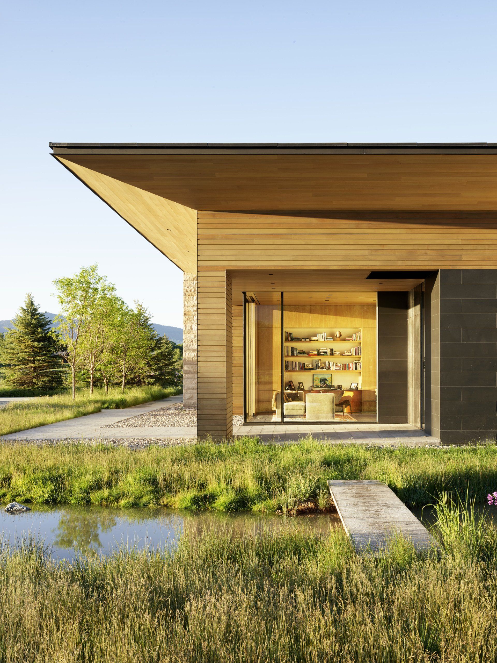 A dramatic approach teases views of the home through a sea of trees before carrying visitors over a bridge and onto the property. While most ponds in Teton County require a 50-foot buffer between home and water, this man-made body of water has the freedom to forego that restriction. The resulting interplay, which flows from the living area to a partially covered heroic porch and eventually to the water’s edge, spotlights the deliberate connection between the home and its surrounding environment.