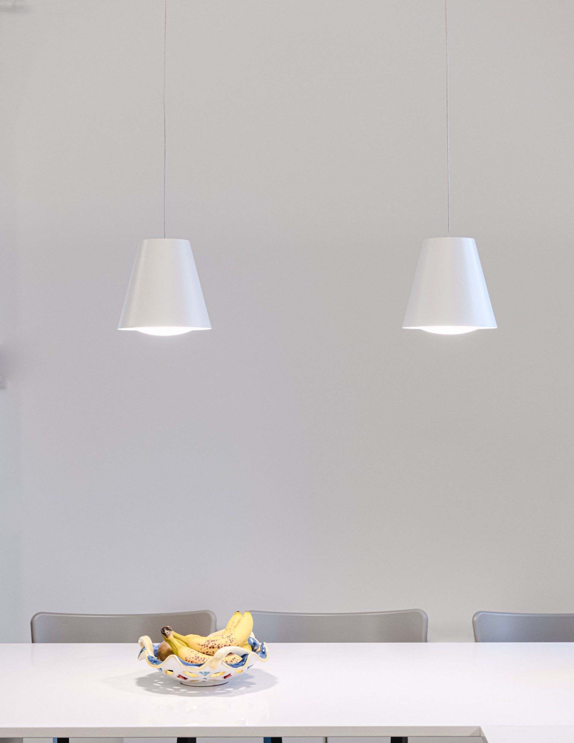 Great attention also for the living room where the ceiling light of the Conus series was used in combination with a LED strip behind the equipped wall, with a decorative function.