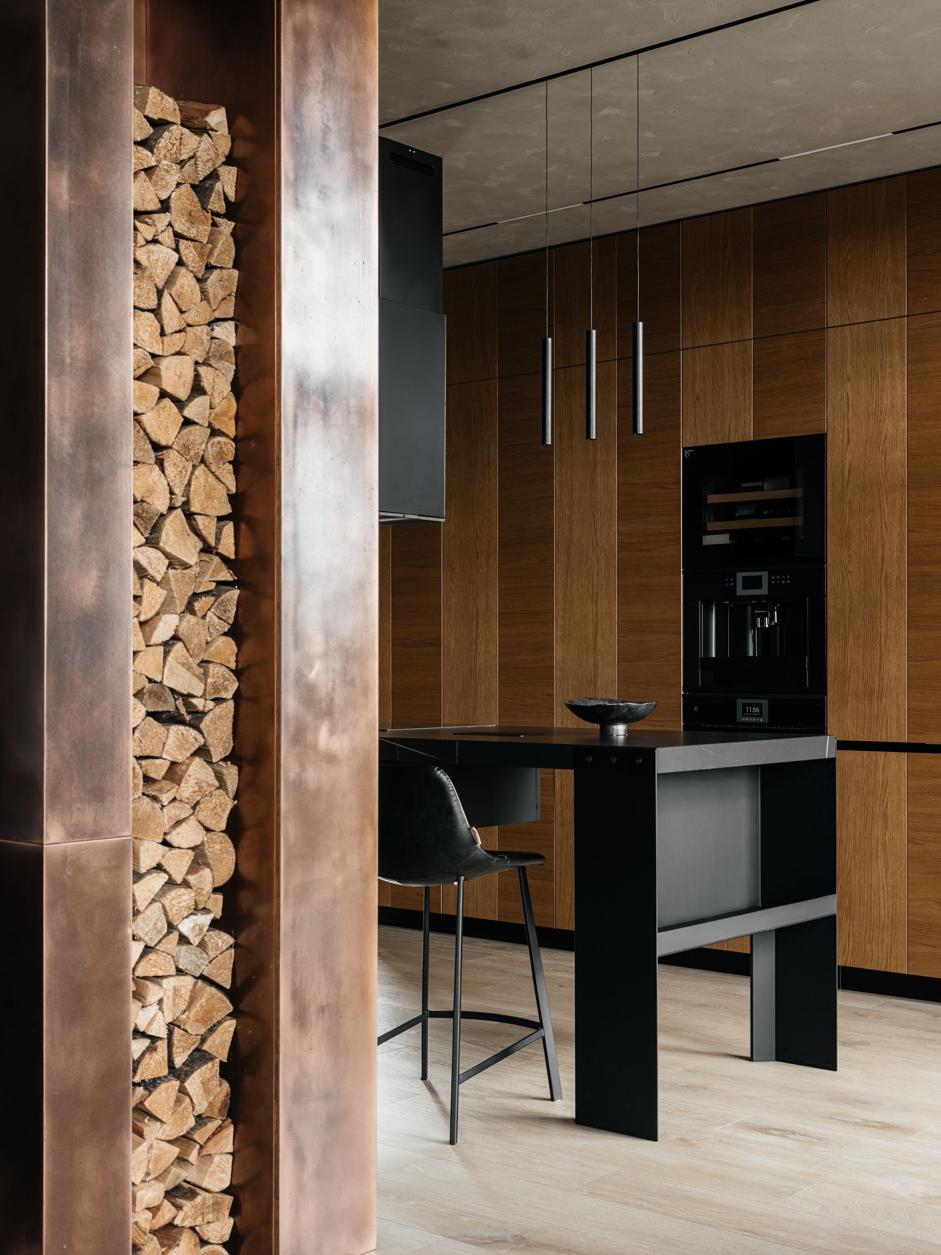 The ground floor of the apartment is a completely public area. It houses a kitchen from the Chesar factory (the only one in Russia), a living room with a fireplace lined with copper panels, a home theater and a children's playroom.
