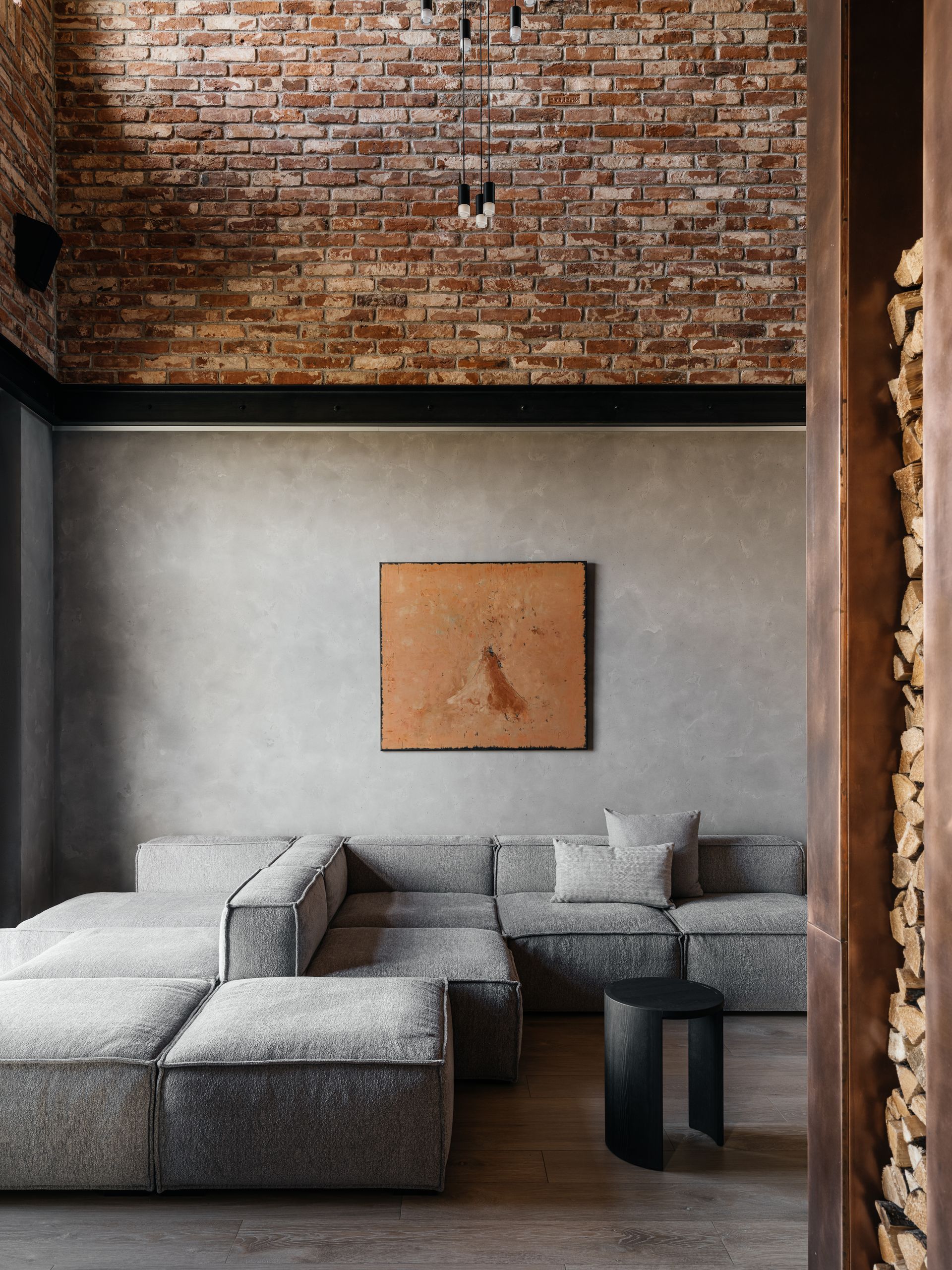 Micro-cement and barn bricks brought from St. Petersburg were used for wall decoration.