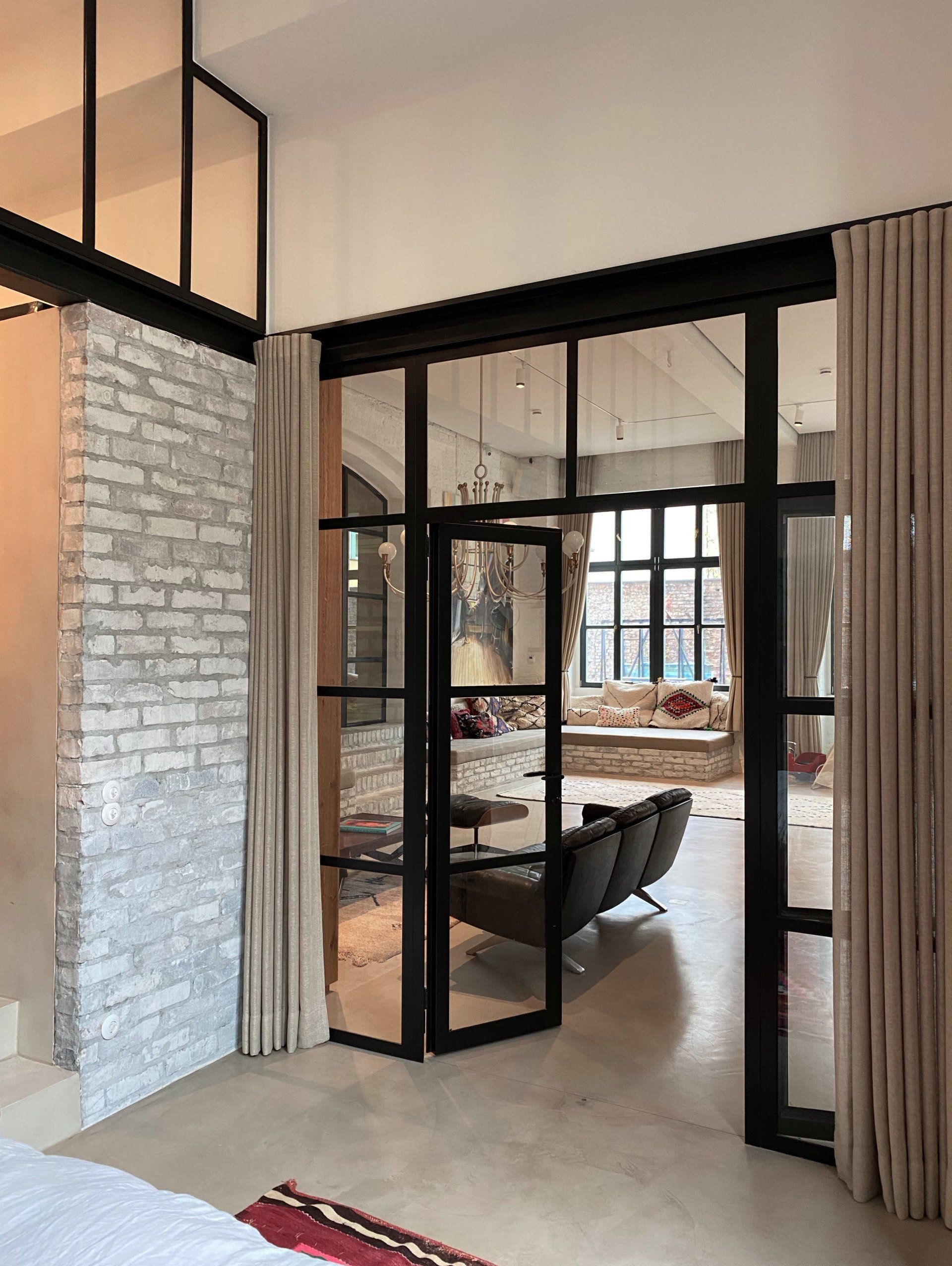The materials used correspond to the character of the workshop, such as raw brick and oiled metal. In addition, a large, solid brick step was introduced as a space-forming element, which connects to a mighty open fireplace.
