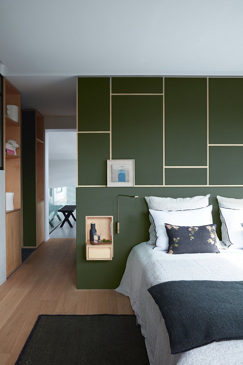 The dressing room and the headboard of the master bedroom combine birch and wood panels covered with textured painter's canvas.