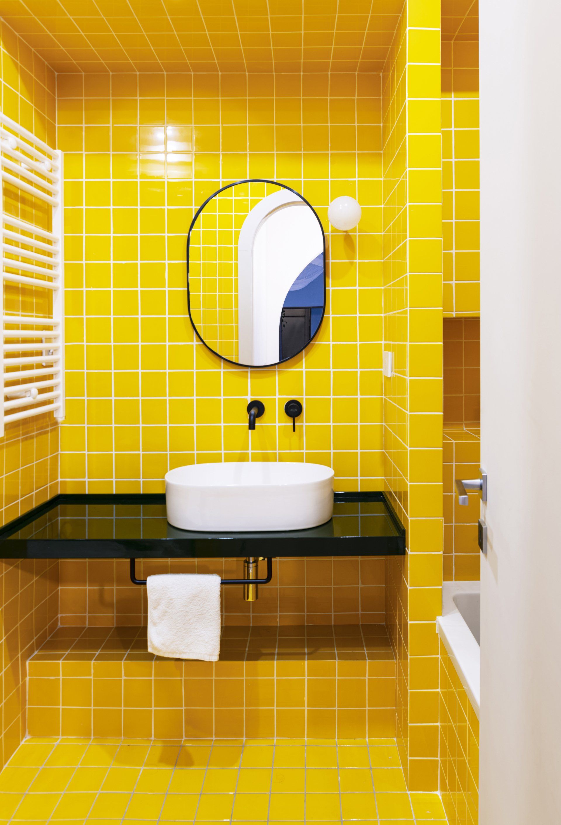 A second bathroom completely covered with medium yellow 10x10cm tiles by Senio was added.