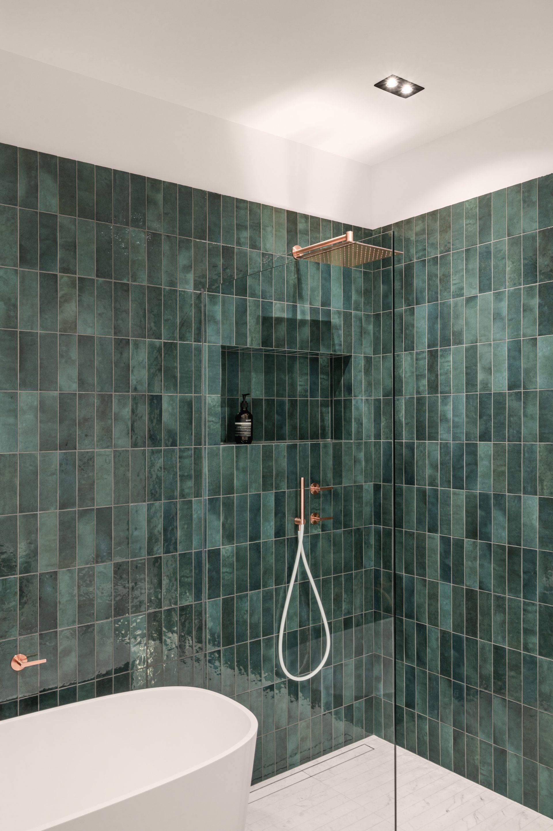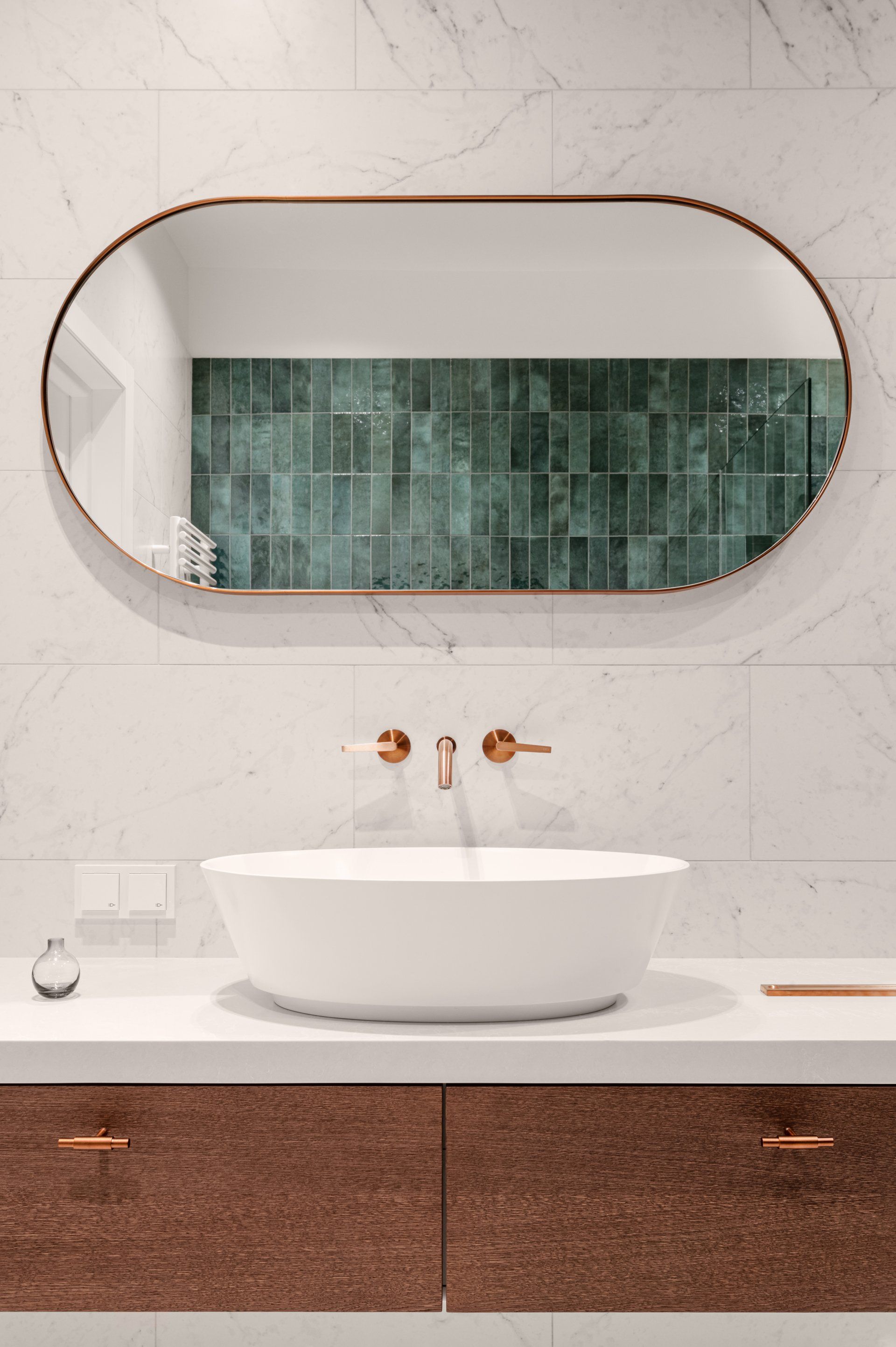 The bathroom is without complex structures, floor drops and steps. One of the requirements for the bathroom was “extreme minimalism”. The colors in the bathroom are uniformed: mixers, furniture handles, mirror frame had to be the same color and texture. The mirror frame and furniture handles were made of brass and tinted to match the color of the faucets perfectly. With the contractor, the designers developed a system for installing a glass partition without visible fasteners and profiles.