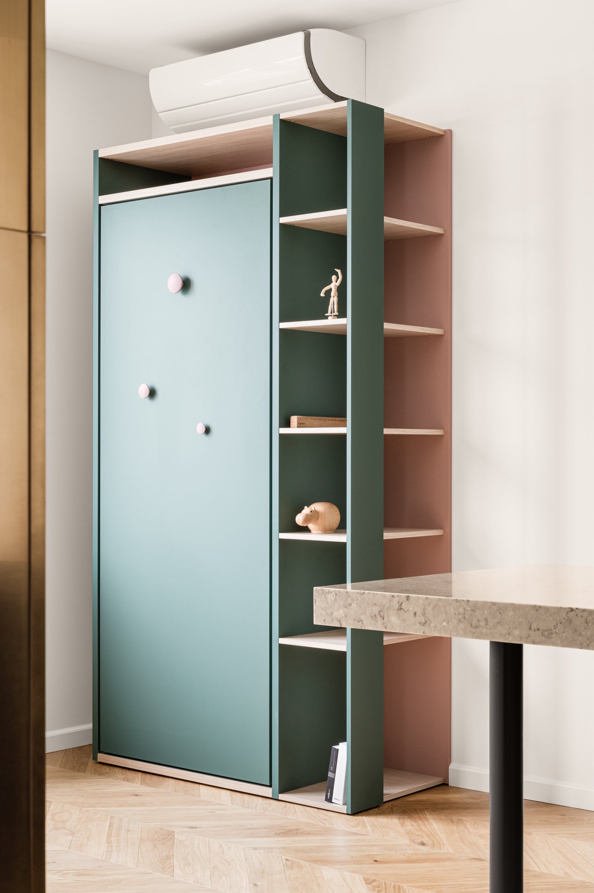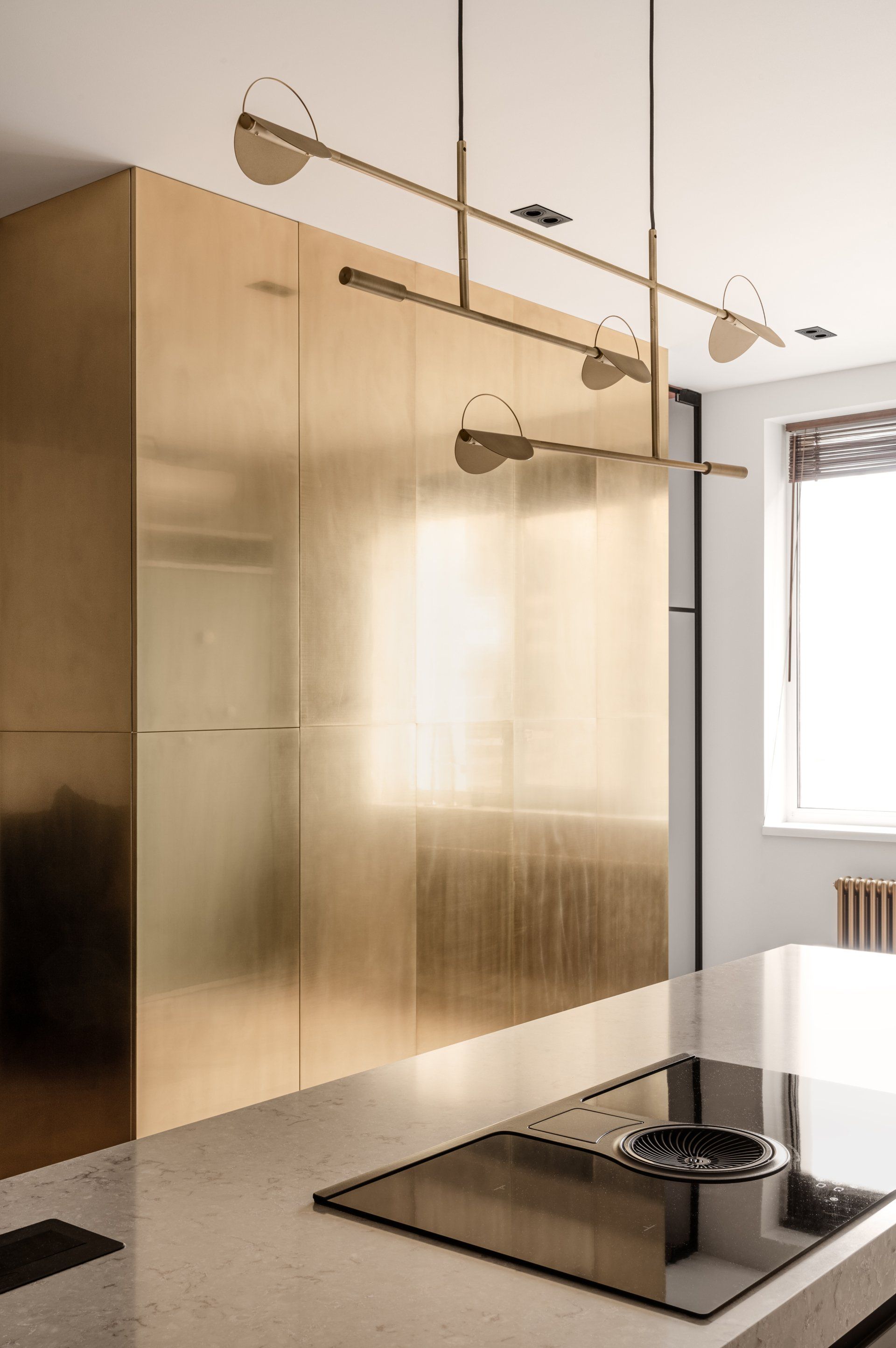 The apartment is designed in a way that maximizes open space. The kitchen, living room and children's playing area are all shared. The bedroom is separated from the main area by a brassed wardrobe and glass partition. There are additional curtains to further close the room from the rest of the apartment. The cabinet faced with brass is the centerpiece of the apartment. This is a functional wardrobe with brass sheet fronts which will age beautifully and change the appearance. Over time, scratches, stains may appear on it, it may change color. But this gives it a special charm. Such a thing will have a special history. Since brass is an extremely delicate material but it had to look perfect, contractors polished and varnished it to protect it from further damage. The accents change depending on where you stand: red wall, brass cabinet, veneered kitchen, pendant lamp.