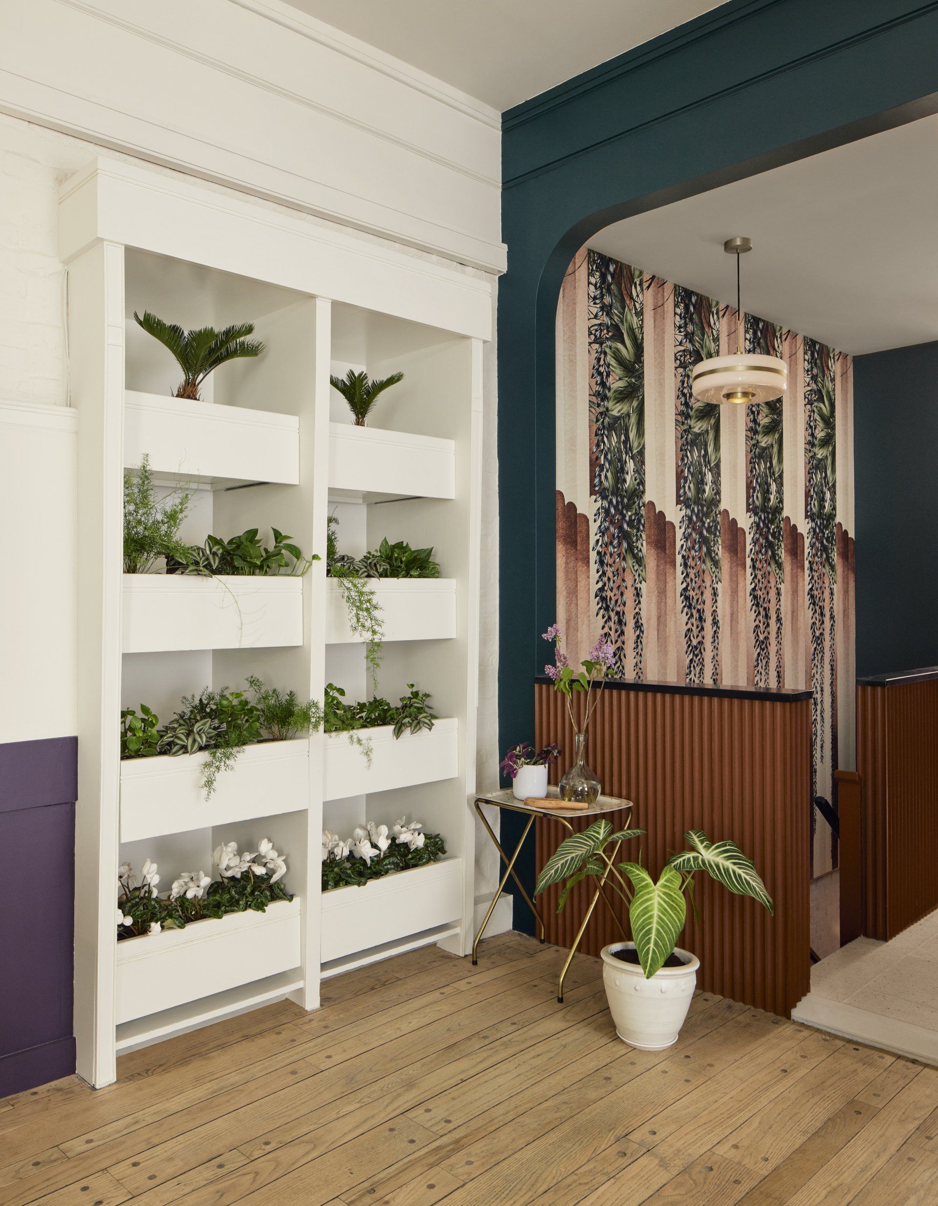 A color palette derived from vegetables found in the restaurant’s kitchen (eggplant purple, leafy greens), along with cream and pale lavender accents, complement these details.