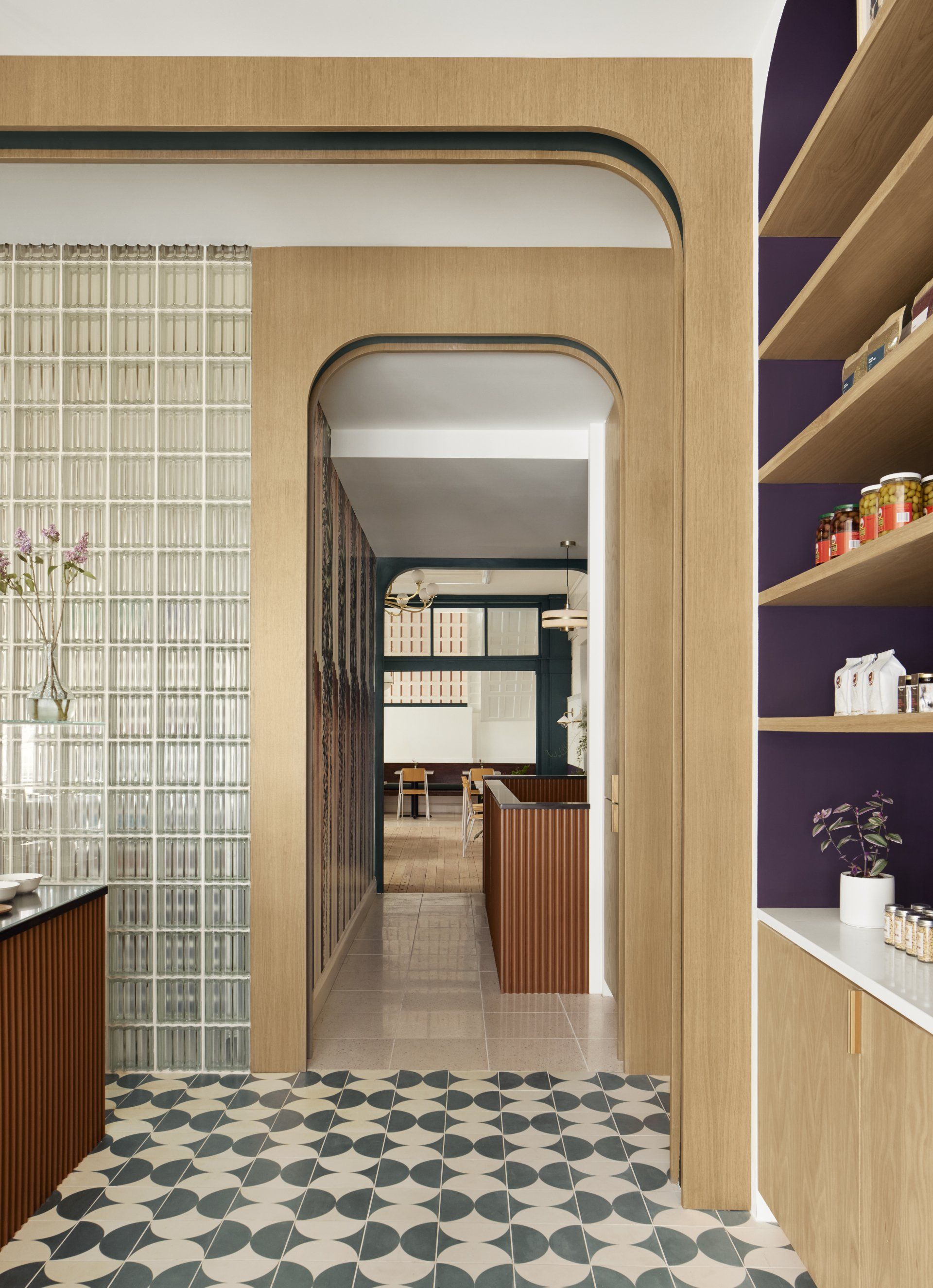 Integrally, FTA reorganized the original layout, moving the kitchen to the center of the overall space. Just beyond the front counter, the kitchen is now visible through a new glass block wall in a Doric Neutro pattern, whose texture nods to the counter’s signature fluting. This decision allowed for efficient segmentation, with the counter/cafe in front, kitchen in the middle, and additional seating and event space in the back. A hallway covered in a cascading vine wallpaper extends along one side of the kitchen, leading to the rear seating.