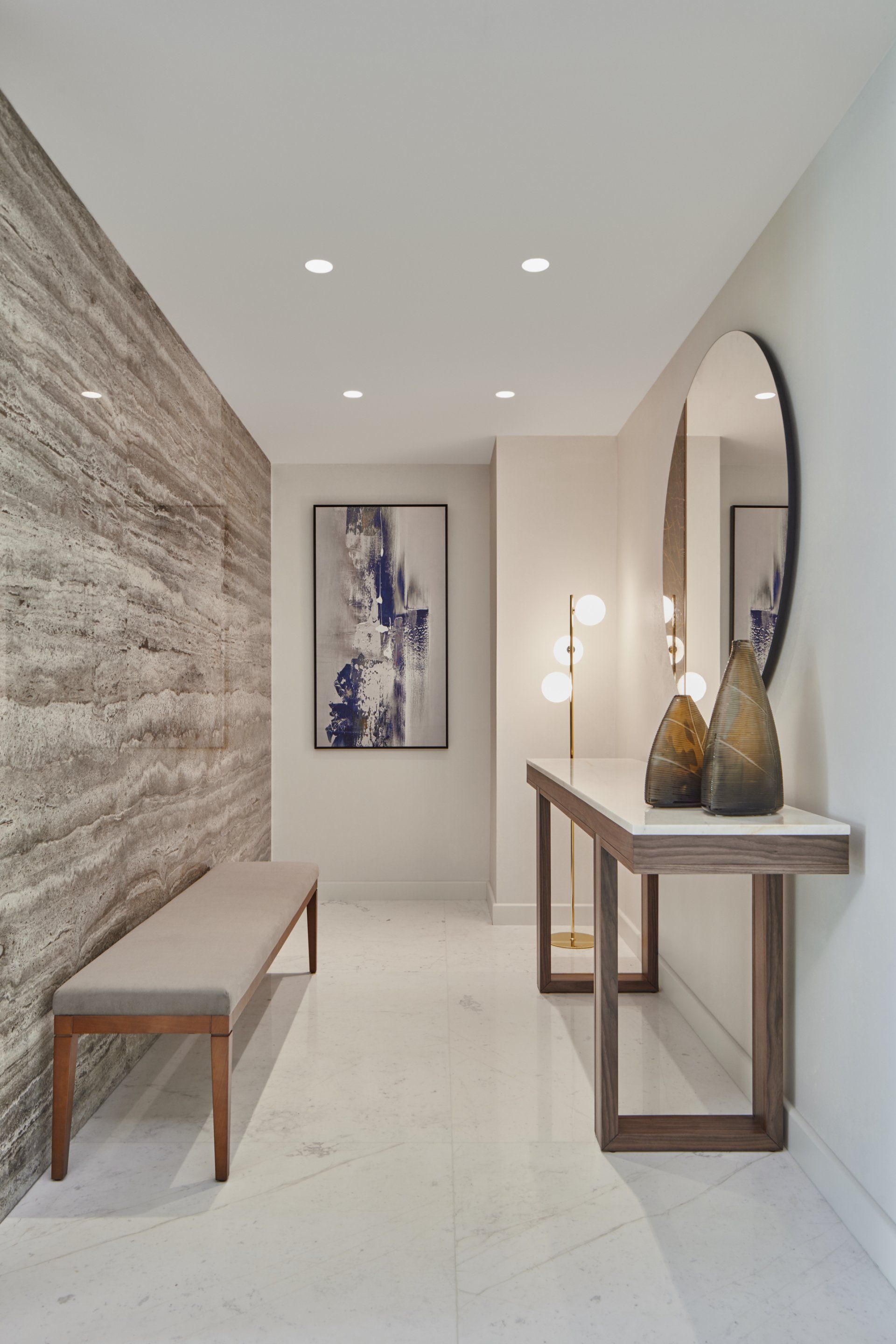 The Palm Dubai is the self-styled eighth wonder of the world. The client wanted to incorporate the splendour of the ocean-based island in the penthouse. White walls reflect the beautiful seaside light throughout the penthouse. Soothing white and muted grey marble is used throughout the opulent living quarters, the highlight of which is the floor to ceiling marble-clad wall that is accentuated with brass light fittings and exquisite art. Four pods of three-dimensional blown glass bauble chandeliers cast beautiful beams of light from the ceiling throughout the open-plan room. The kitchen is primarily white with a blue accent panel of hand-crafted cabinets and complementary art.
