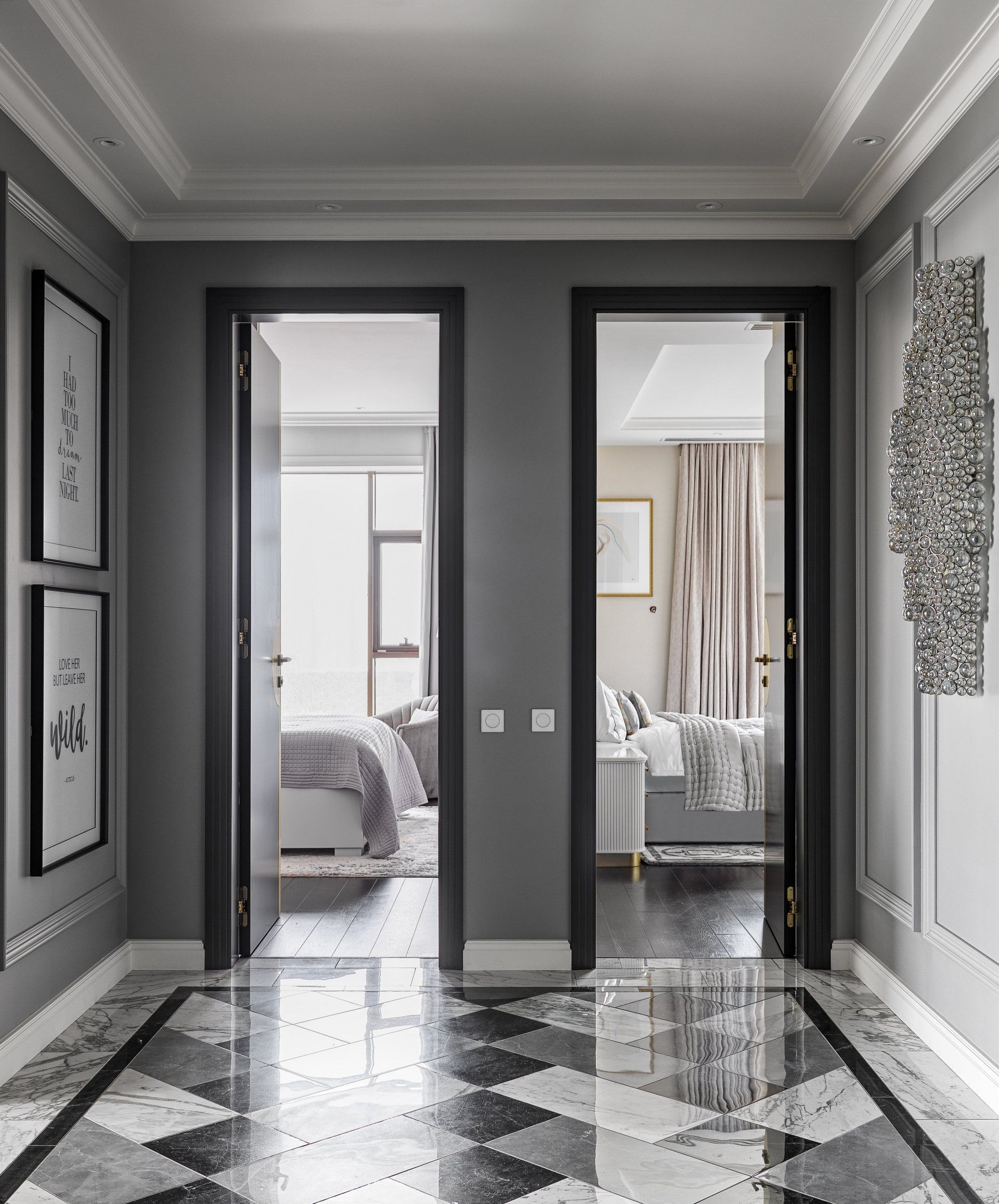 It took Olga Ashby Interiors an enormous amount of time and effort to complete the project, but they particularly enjoyed developing the design of all the bespoke furniture in their studio. The range of finishes used were truly a key aspect of this project; birdseye and sycamore laser cut veneers, natural shagreen, rock crystal, hand-blown glass, and much more. It gave the designers the perfect pallet to work with. Unusual finishes and bespoke solutions became a vital part of the interior design process.