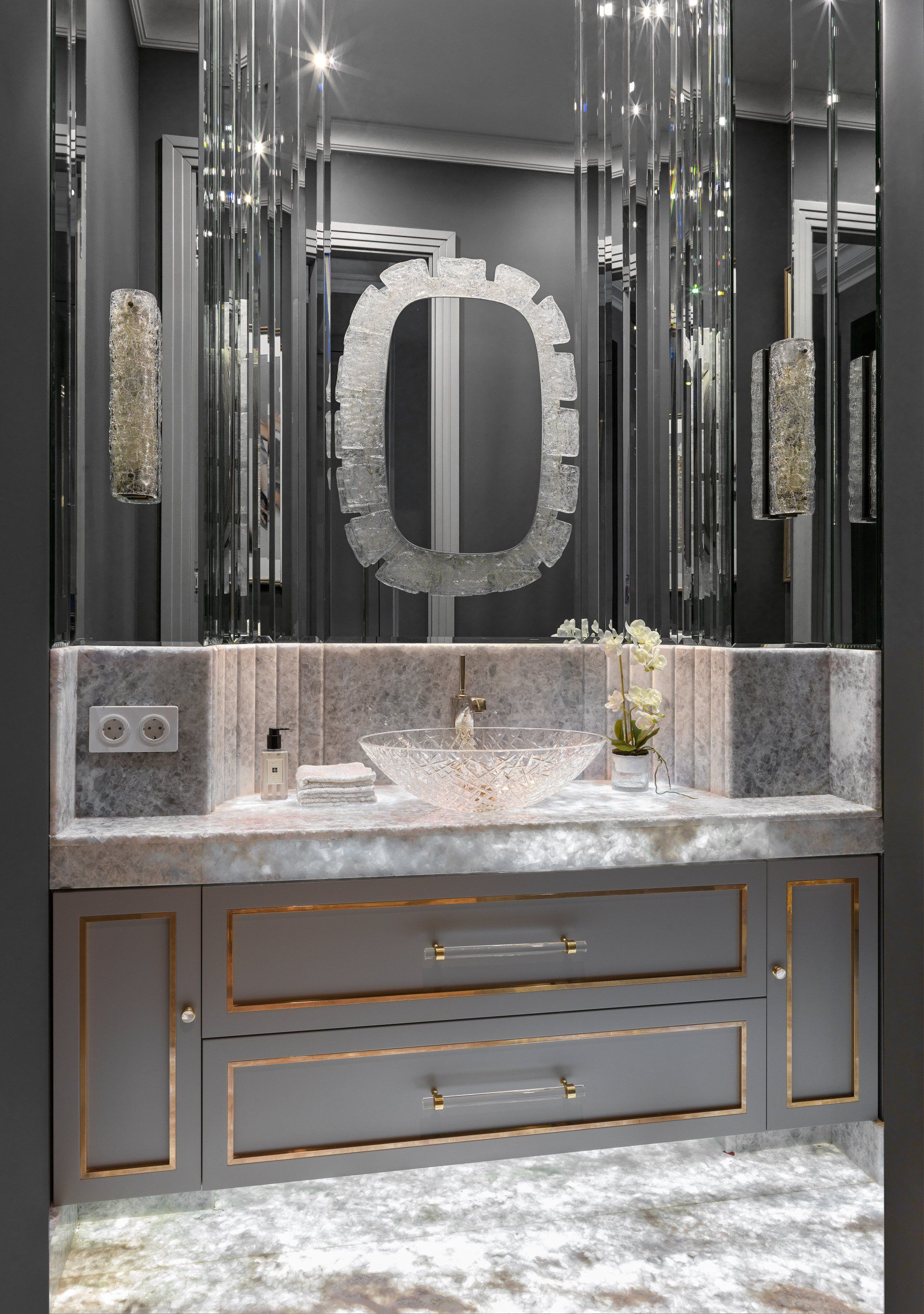 One of the major requirements was an impressive “treasure box” style powder room, meant to impress the guests of the house.