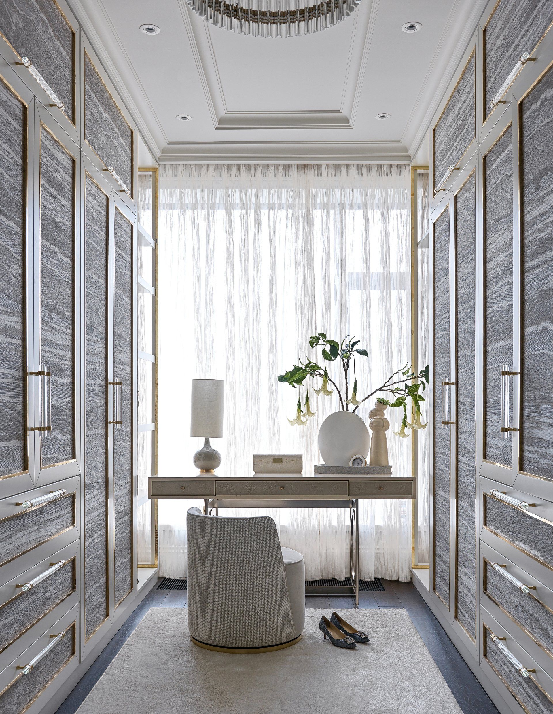 The owner travels a lot and is used to the comfort of 5-star hotel suites, so she expected nothing less from her own private quarters in her primary residence. Olga Ashby Interiors created a 900 sq. ft. master suite as a self-sufficient apartment, with comfortable circular planning. Two doors on both sides of the bed lead to a wardrobe and bathroom, both spaces are connected inside which provides a very comfortable flow. As each space benefits from lots of light streaming through panoramic windows, there are no dark corners in the space. In this size of a bedroom, even an emperor sized bed with a 3-seater sofa in front of it doesn’t seem too big.