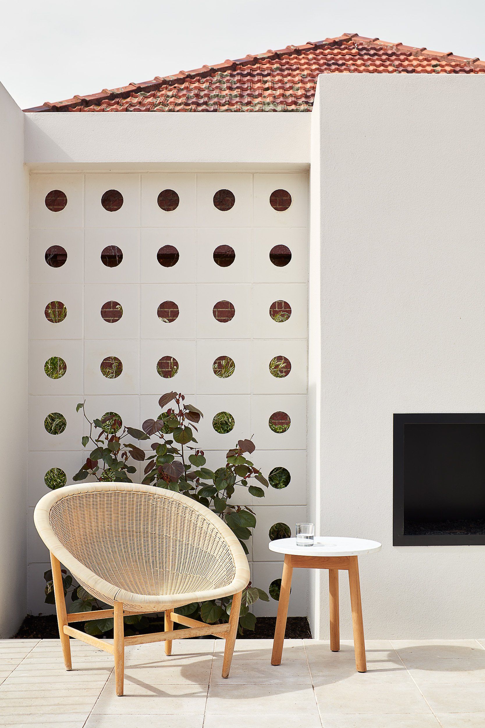 An extended elevated outdoor deck space, anchored by a fireplace, provides an entertaining space that enjoys the views and amenity of the established gardens and river glimpses. Perforated conical breeze blocks evoke the graphic language of original cast plaster ornament, and provide scalloped dappled light, ventilation and screening.