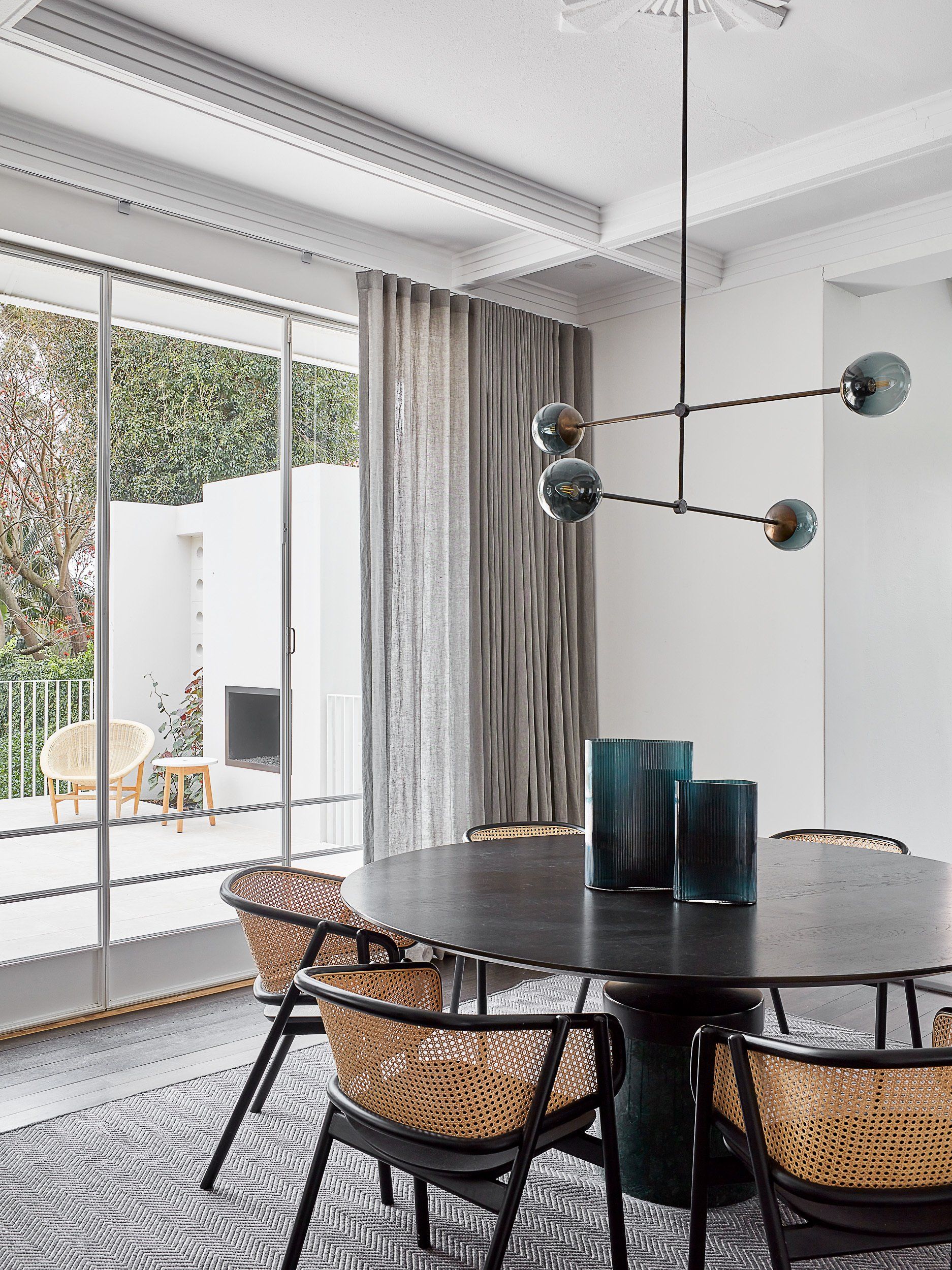 Dining table: Mobilia Custom / Dining chairs: Trit House Cane Casey Chair / Sofa, Armchairs & Coffee table: client’s own collection / Flooring: New and Existing Jarrah T&G boards w/ black stain / Fireplace: Escea 960