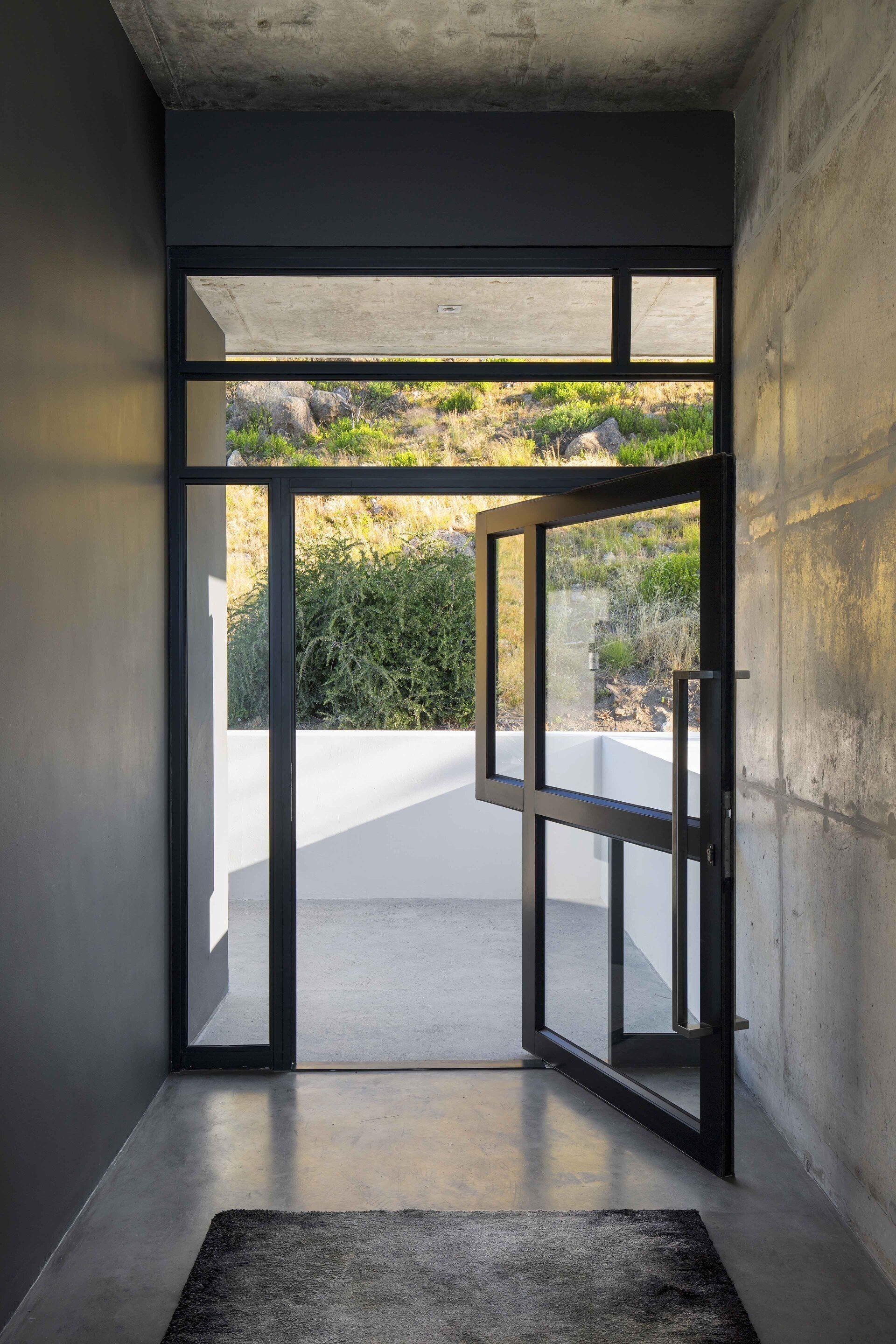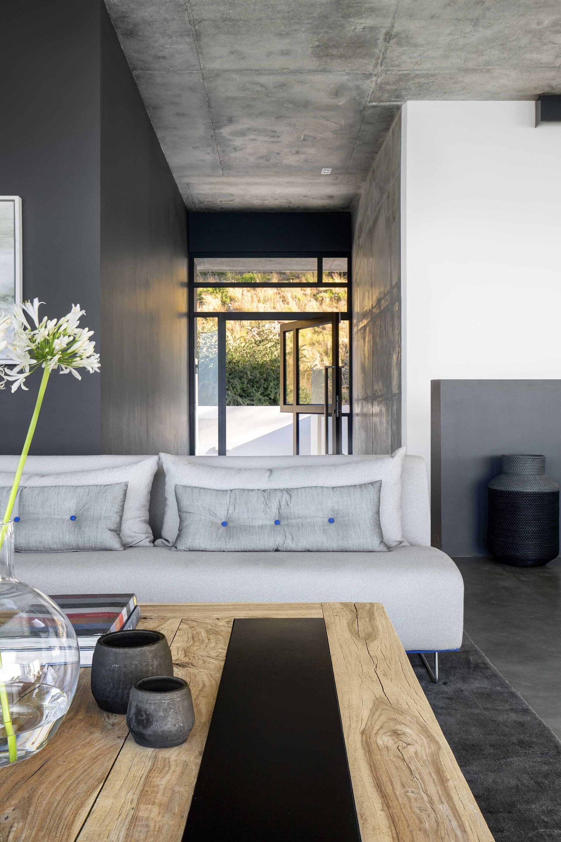 The building that has a strong presence as a sculpture and also a very strong connection to its environment and views. Jenny Mills Architects used a reduced palette of concrete greys and white. This muted colour selection allows the play of light and shadows to be more visible. It is a dynamic composition of massive horizontal and vertical planes of concrete, glass and plastered surfaces. External light plays are exquisite, internal lighting in the evenings an enhancement beyond expectation.
