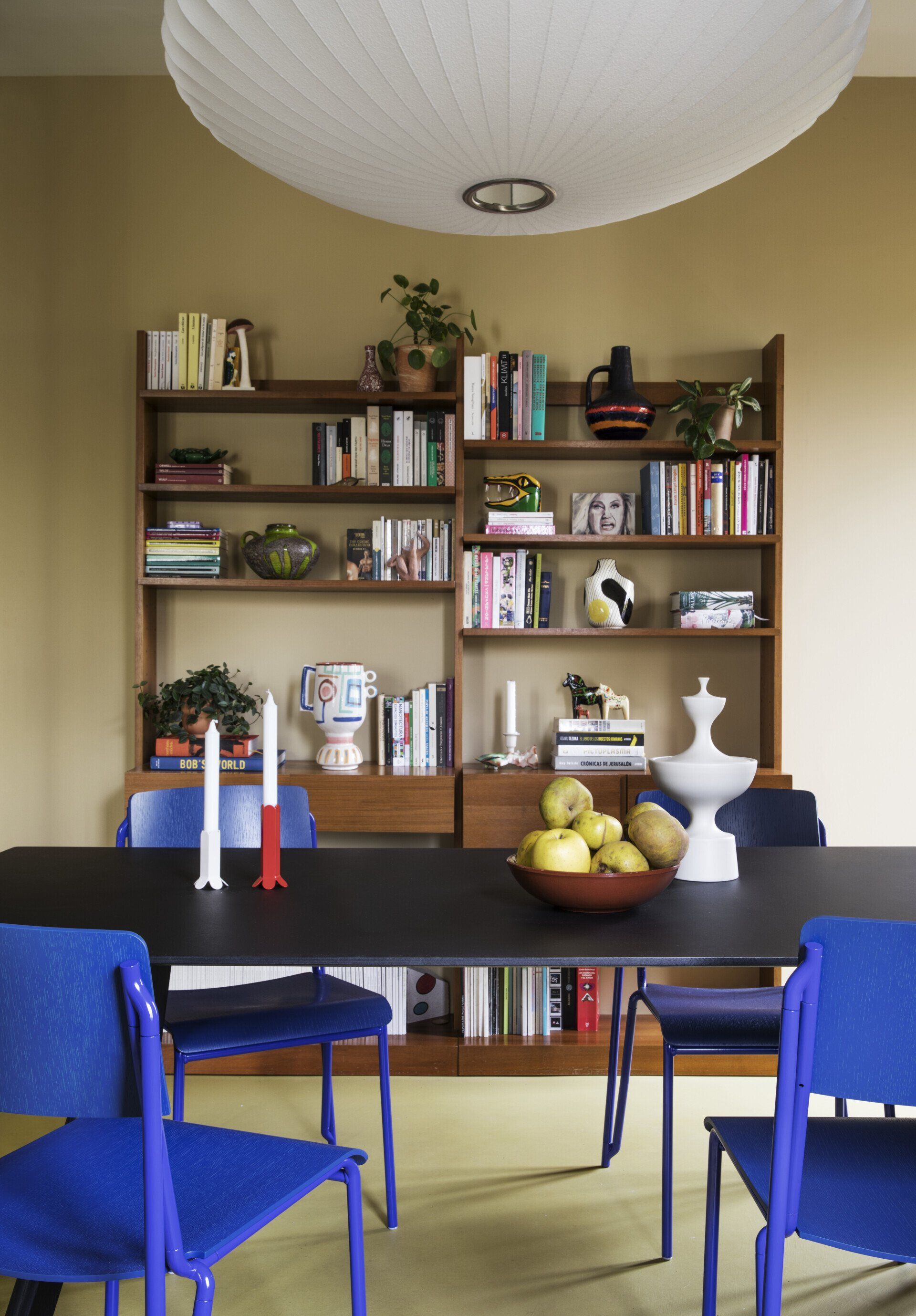 In contrast to the regionalist style of the building's façade, the inspiration for the interior project was the Sonneveld House (Rottherdam 1930), due to the use of color and materials in the different rooms. The new distribution aims to give priority to spaces with an obvious social function, uniting the dining room, living room and kitchen in a single 45m2 room. This space is characterized by being the only one whose walls have a neutral, light beige base. For the floor, a green-based lime mortar is chosen. This floor, together with the metal pillars, the partition curtain and part of the furniture, manage to generate a dynamic space where color is strongly present, but only occasionally.