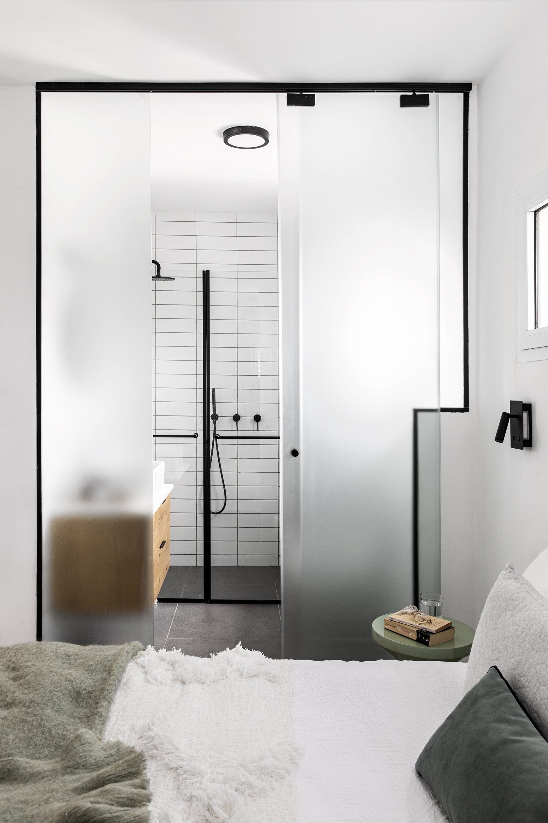 In the master suite, a glass partition with a sliding door and a steel frame creates a division between the bathroom and the bedroom. Thus allowing a slight redistribution of the spaces and a subtle expansion of the bedroom. A wooden black bed stands in the center of the room, alongside it are two different mint-green side tables and two black wall mounted lamps. In front of the bed is a large closet with white doors and black handles. Here too black track lights were installed in front of the closet and next to it two white decorative shelves were hung.