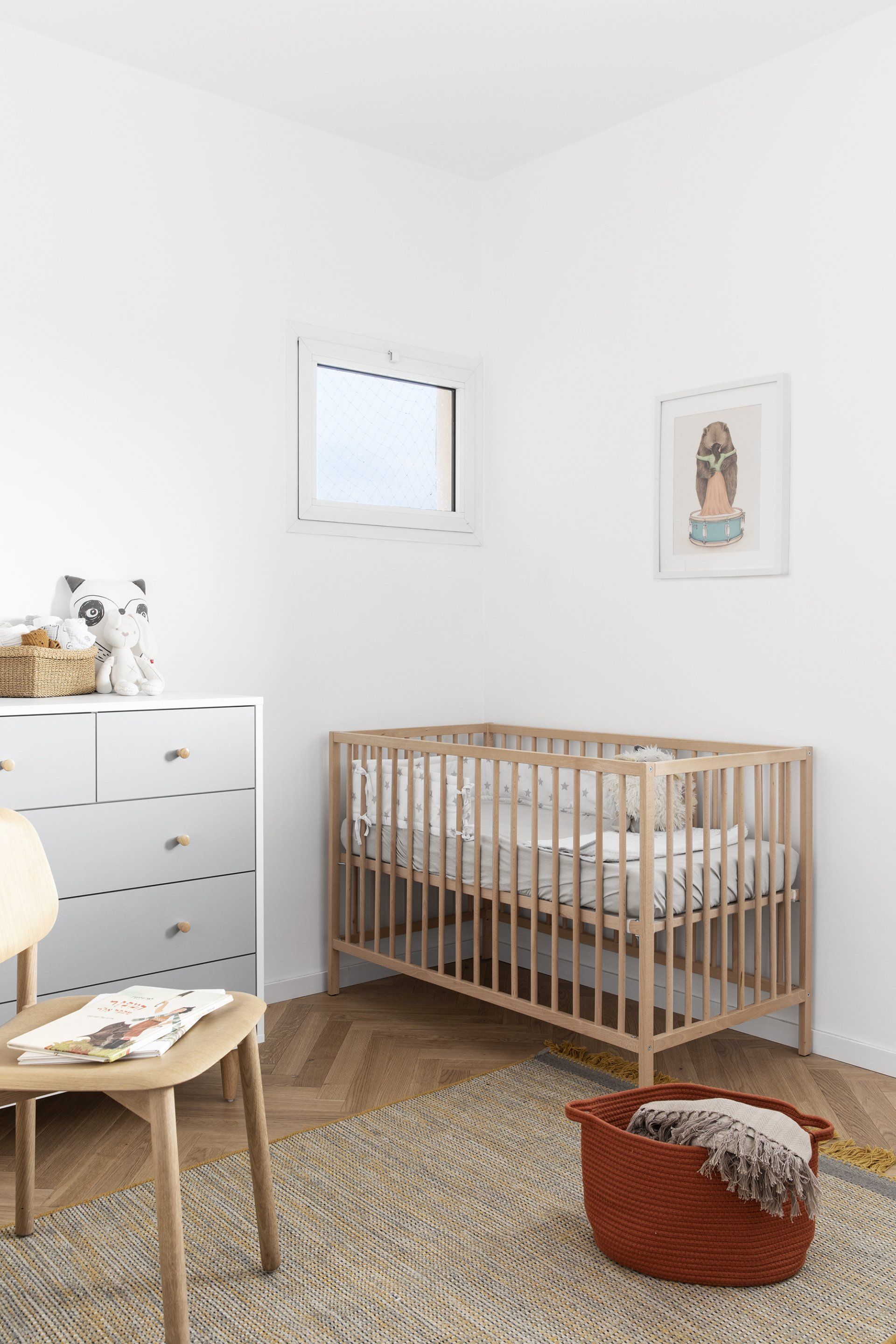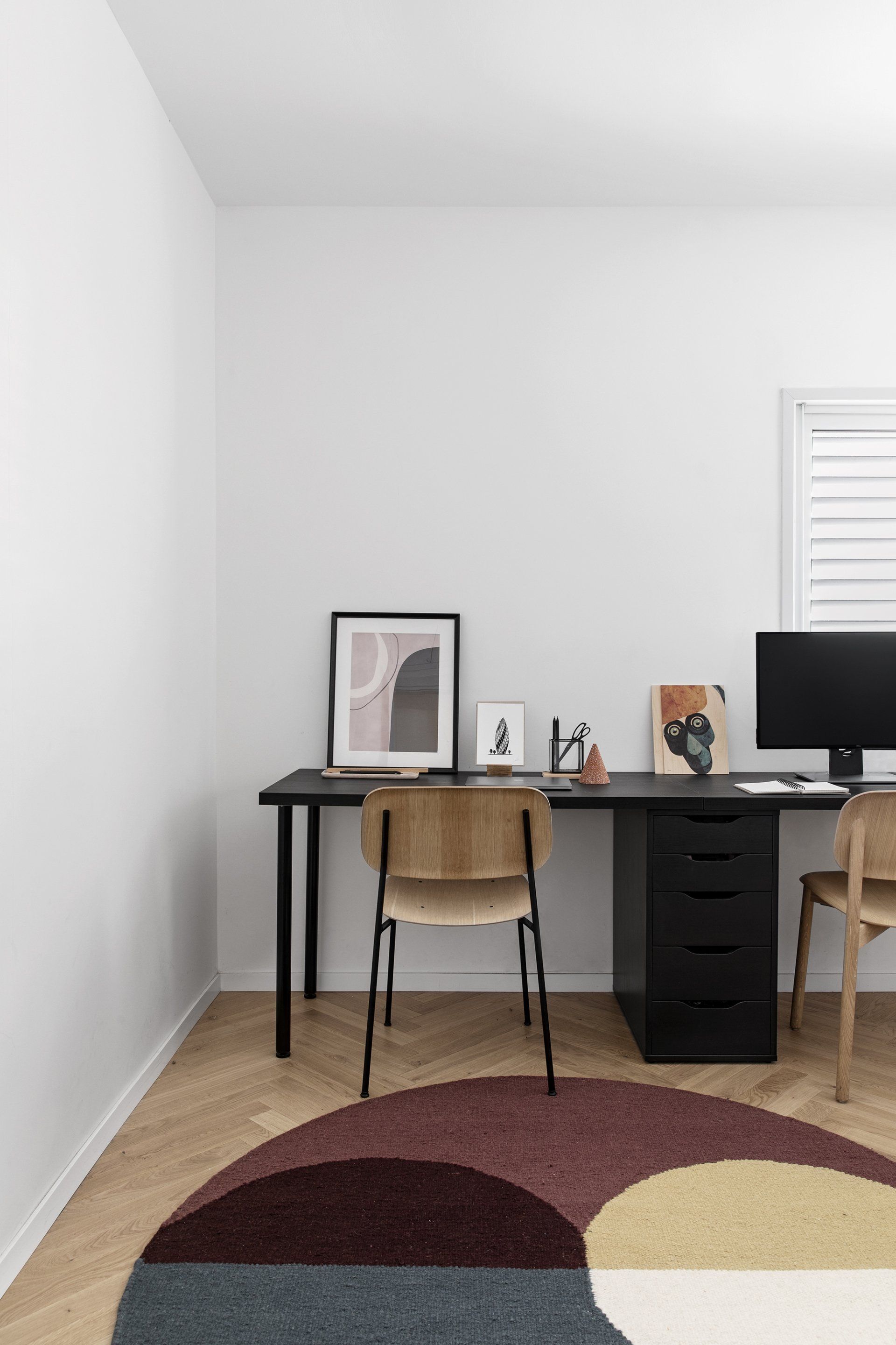 An extra bedroom was made into a home office for the couple. A black double desk was placed along the wall with two similar but different chairs - one with black iron legs and the other with wooden legs. A round carpet with a large geometric pattern adds color and warmth to the room. The nursery is located opposite from the master suite and incorporates a neutral combination of wood and grey furniture with a grey and yellow carpet in the middle.