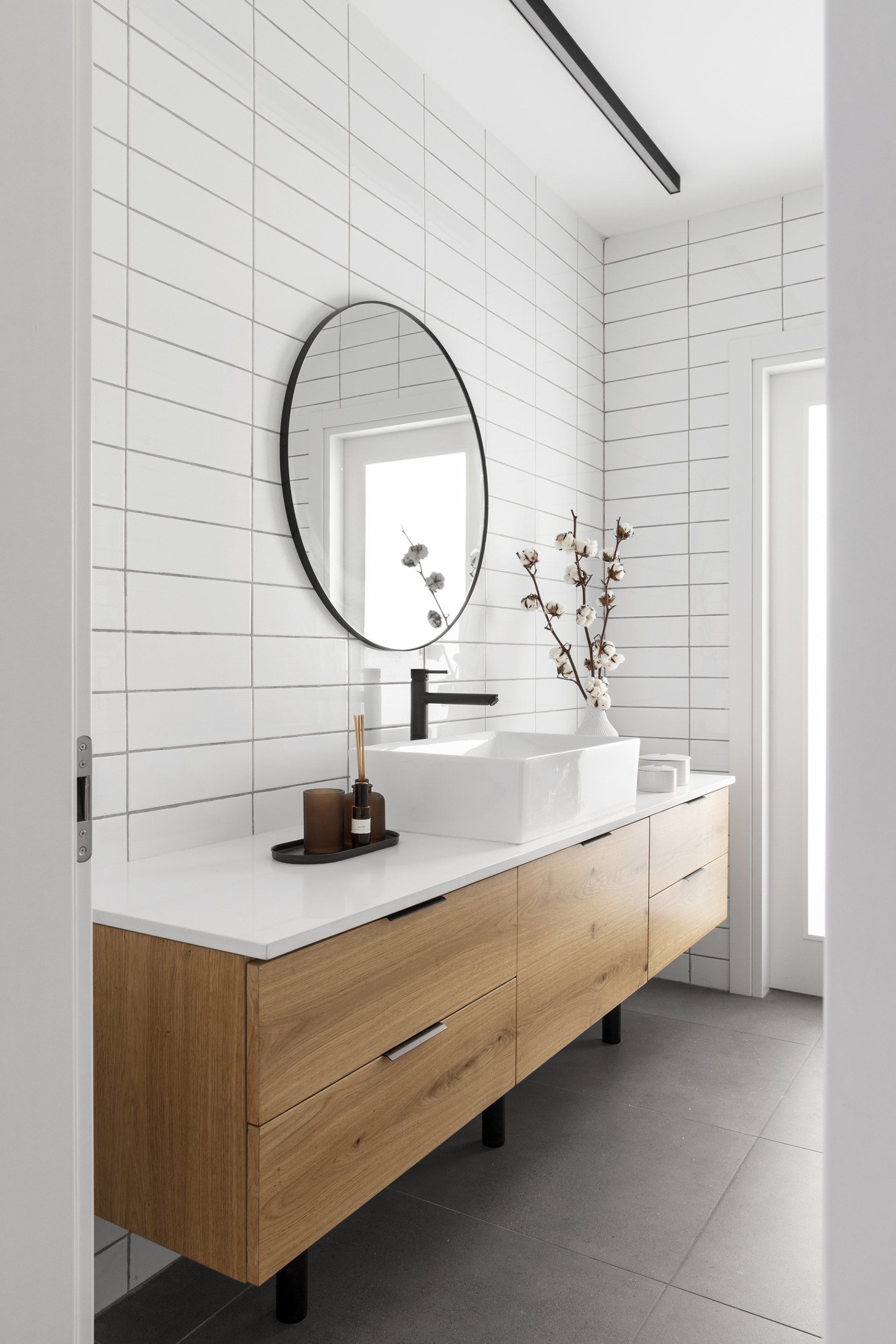 An additional bathroom with access to a utility room was planned instead of the formally existing guest bathroom. Both bathrooms, this and the master bathroom, were designed using similar design elements and materials. Their floors were covered in grey tiles, and white brick tiles cover the walls while creating a sleek grid that makes the spaces feel taller. Black faucets were chosen and the frames of the shower glasses were also painted in black. The cabinets were covered in oak veneer and above them, white surfaces and white vessel sinks were installed. Round mirrors with black frames were hung on the walls and black elongated lighting fixtures were chosen.