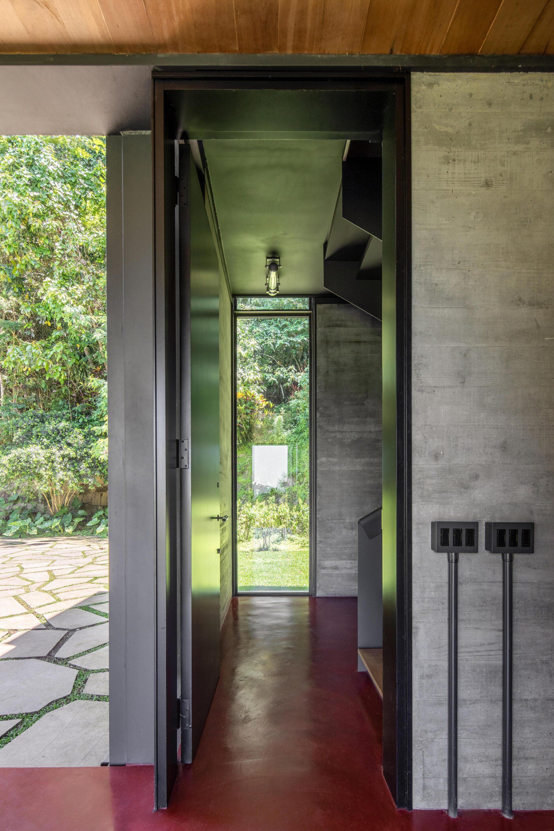 Local construction techniques are incorporated throughout, including board-formed concrete site walls and interior walls of colorful plaster over terracotta in the Brazilian tradition. Floors are Brazilian wood and vermelhão stained concrete, a common vernacular tradition. Painted, marine-grade stainless structural steel – the home’s primary material – stands up to the humid climate where corrosion is a concern. The home is designed for natural ventilation with manual pivot windows and retractable window walls with insect screens. These, along with a solar water heating system, allow the home to function during intermittent power outages.