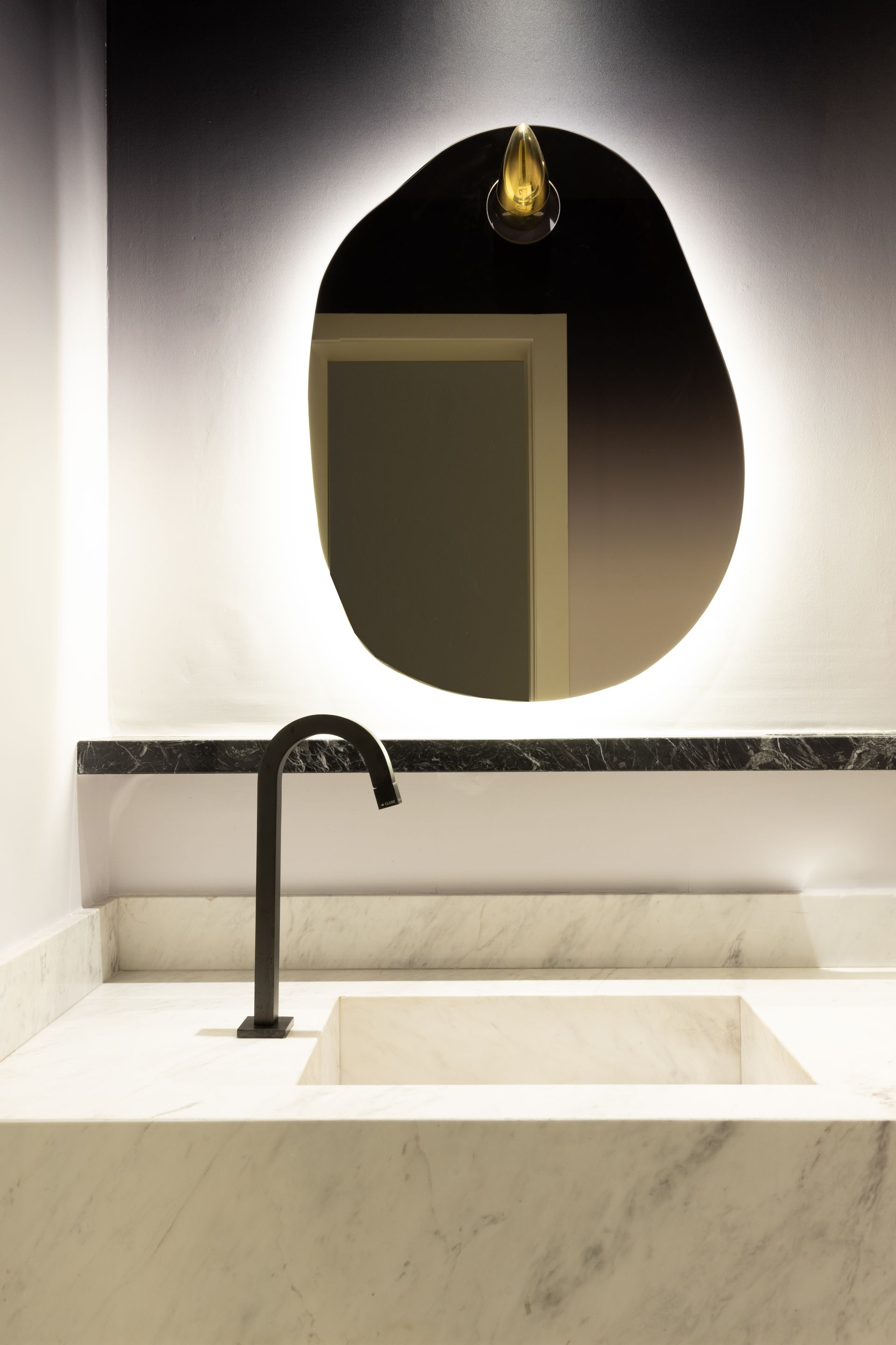 Revamped to reflect the style of its new residents, a young couple who love to entertain and share moments with friends and family, the property places the bar at the forefront of the composition—a meeting point and social space. Reuse was something necessary and a conscious choice in this project because the apartment already had marble flooring in the social area, good cabinets in the private and kitchen areas. The previously dark bar underwent significant changes. The project brought more organic forms to it, as well as choices of coverings and finishes that bring texture surprises.