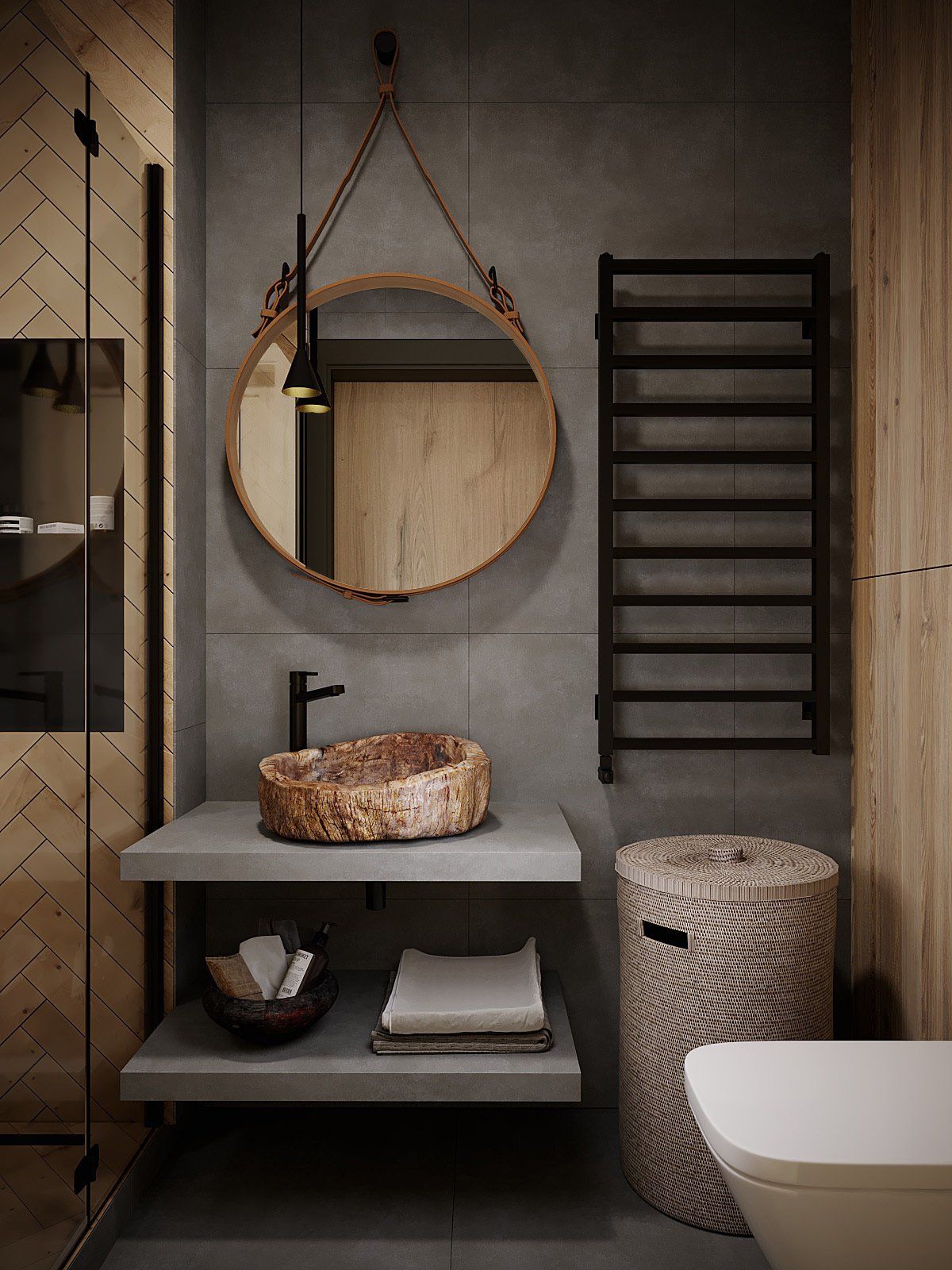 The clients wanted dark bathrooms. In the main bathroom, the base of the composition is a sink and a mirror with coarse leather. Porcelain stoneware with a concrete finish was used, as well as wood-finish tile, which was herringbone to highlight the shower area. Above the installation is a cabinet for additional and aggressive chemicals storage.