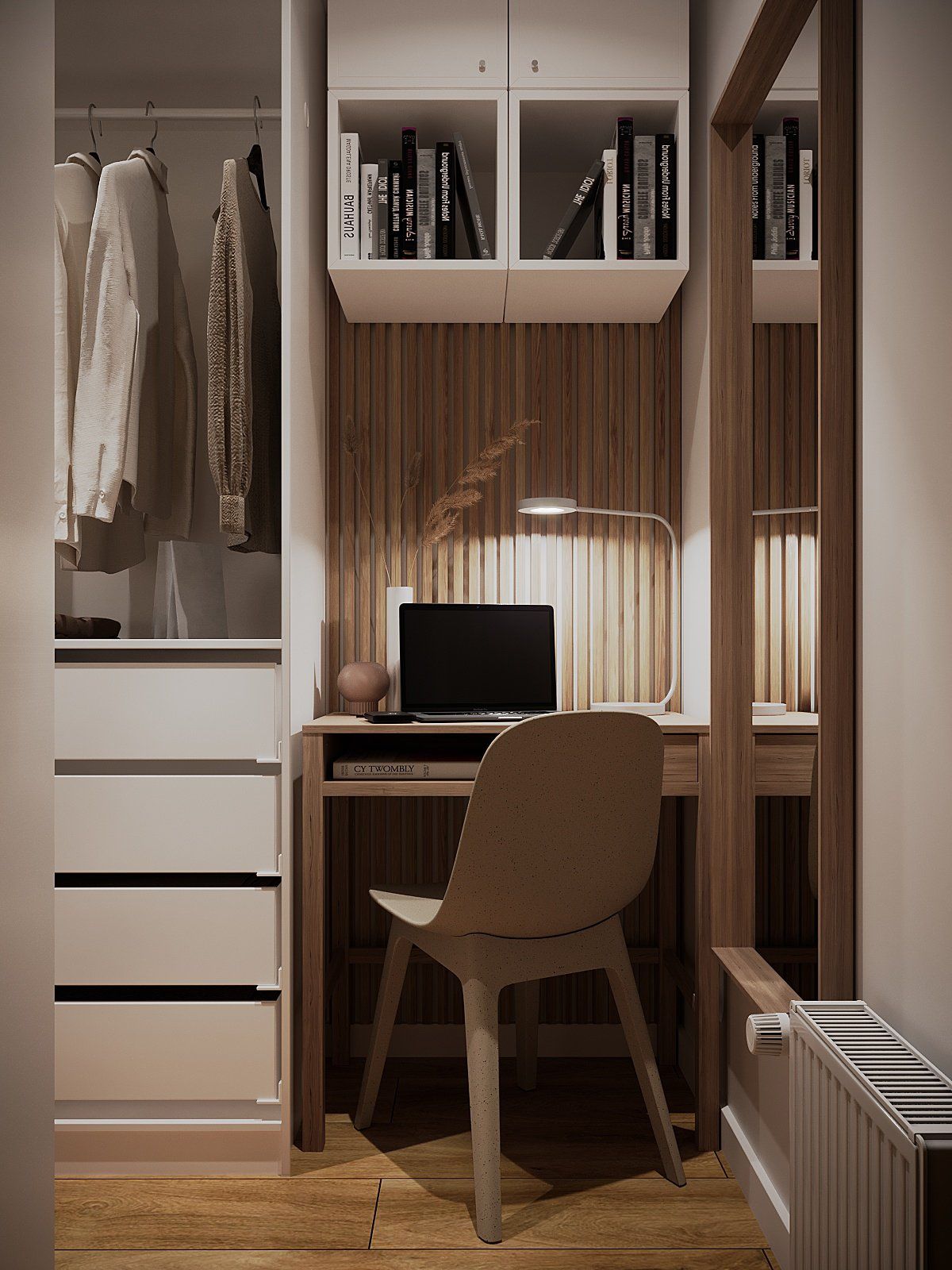 wardrobe is the most functional room in the apartment: there the designers combined the workplace with a dressing room. The wardrobe consists of combined units of Pax Ikea.