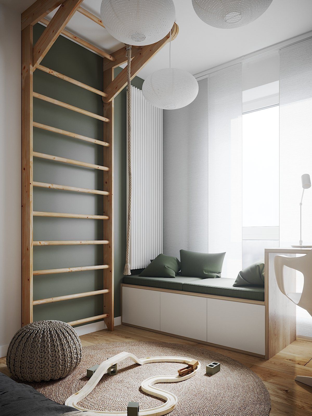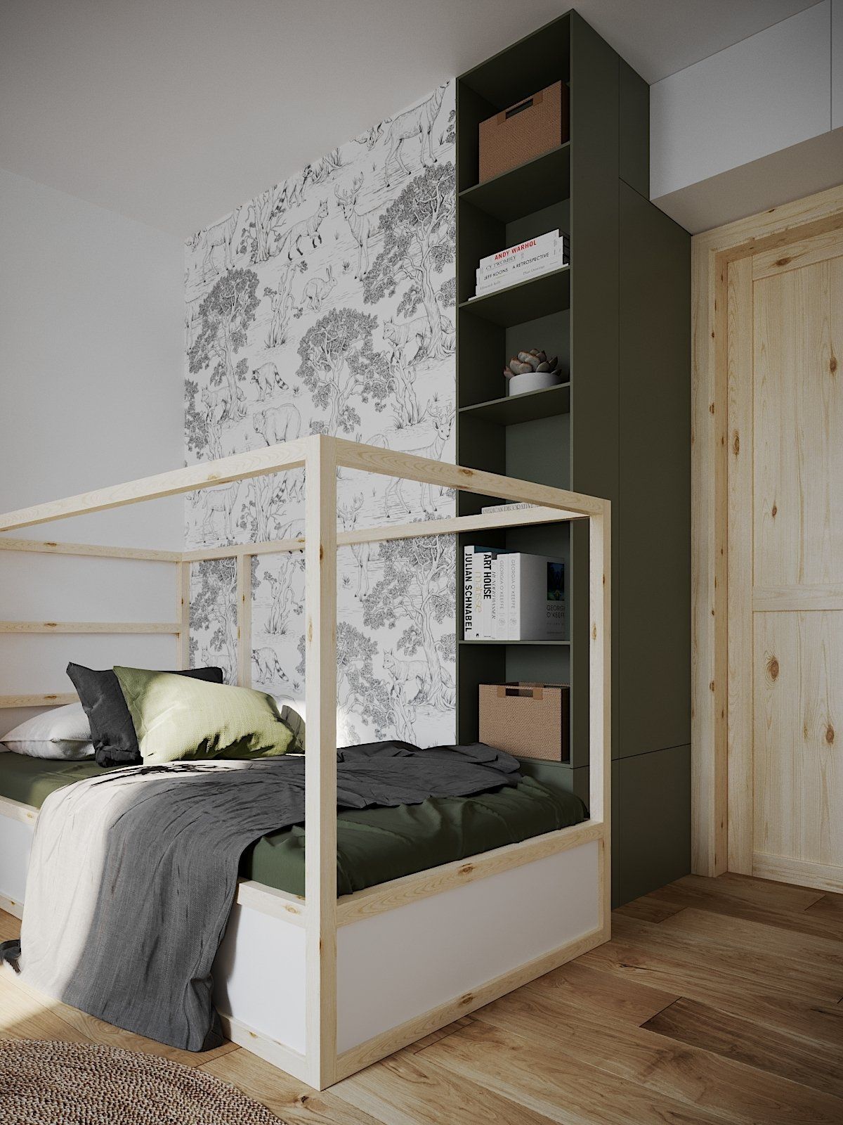 The children's room for a boy was zoned into work, rest and game areas. The workspace is connected to the closet and the seating lounge area. On the desk side are open shelves for textbooks. The bed extends beyond the edge of the wall. The designers added shelves from the bedside and closed storage from the hallway for compositional balance. Also, there was used the space above the door for mezzanine storage. Uniting the whole room in color, they highlighted the Swedish wall with a durable paint to protect the surface from damage during exercise. The accent and the boy's wish was the animal print wallpaper near the bed.