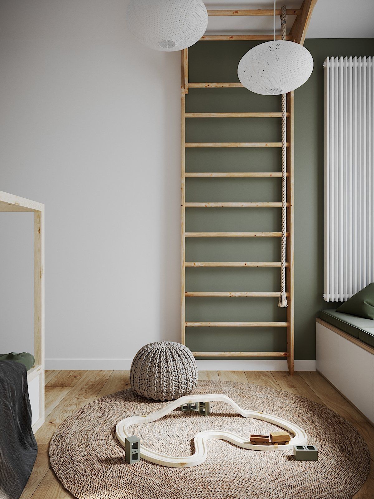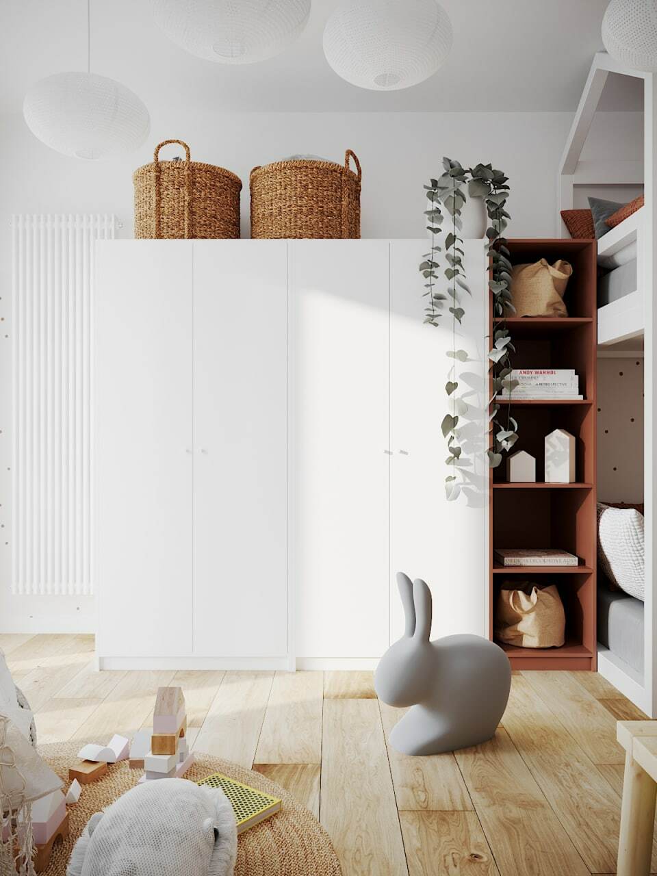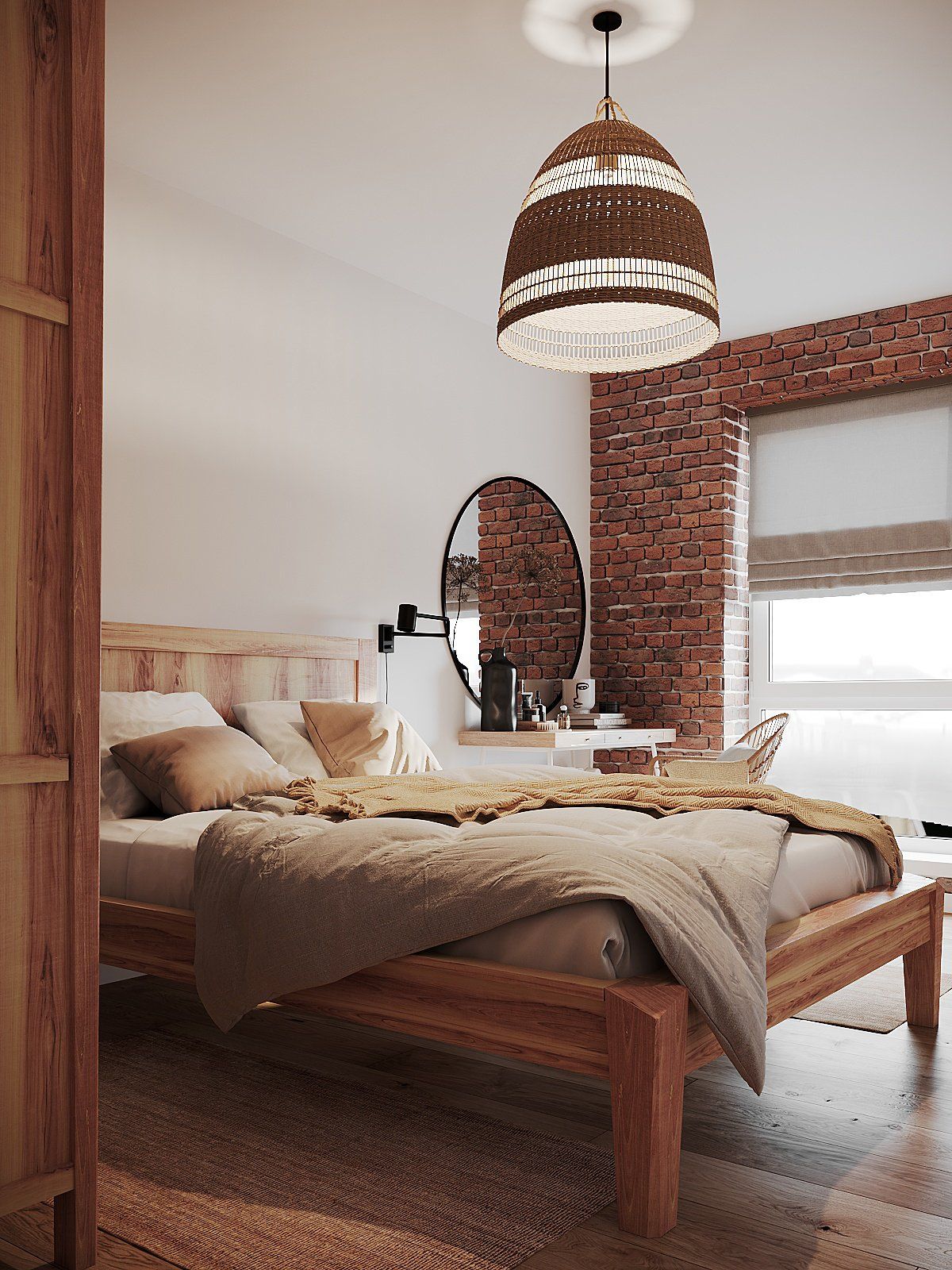 In the master bedroom, the designers accented the window opening with a brick finish. Everything else is a blank paper with lush spots of wood, greenery, terra cotta, and cozy rattan textiles. The lampshade creates very atmospheric light patterns on the walls. Dreams are the most beautiful in such a bedroom.