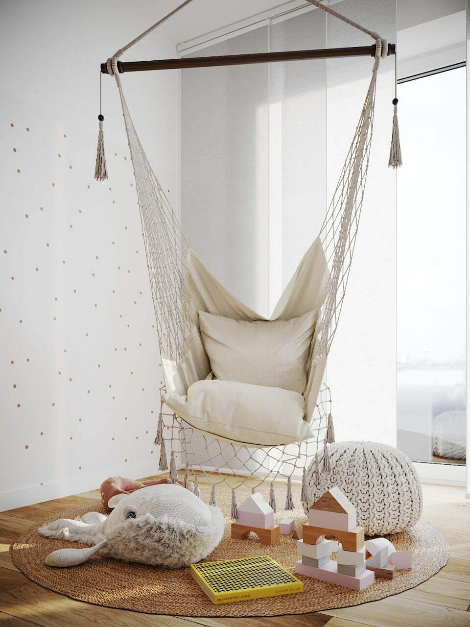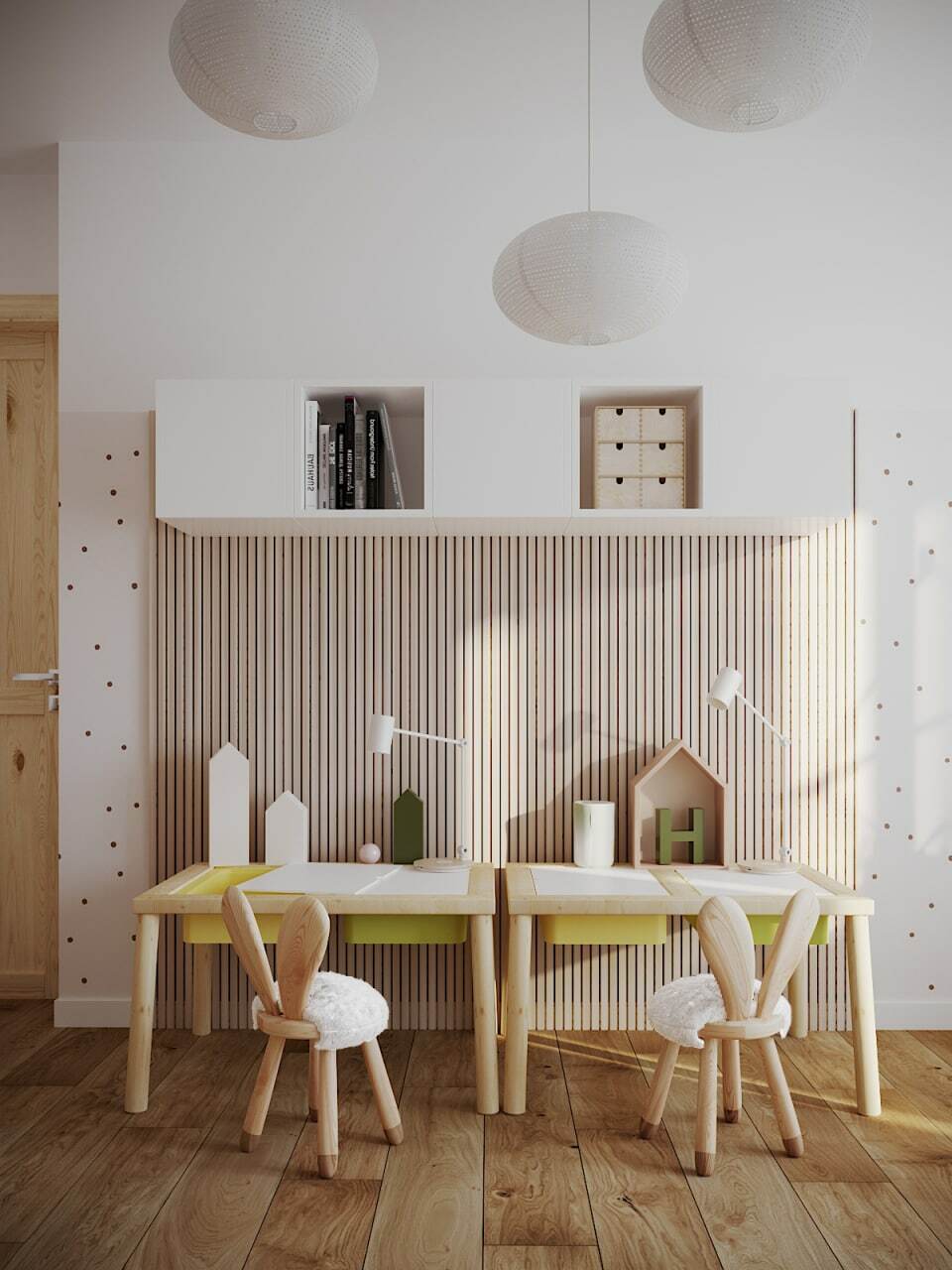 In the same way, also, the children's room for girls was zoned the bedroom into work, rest and game areas. The girls wanted a hanging swing. The desk is developed for the two of them to study. while a large closet was placed for storage. A double bed with steps of cherry color became the center of our composition. Polka-dot wallpapers complement the room interior.