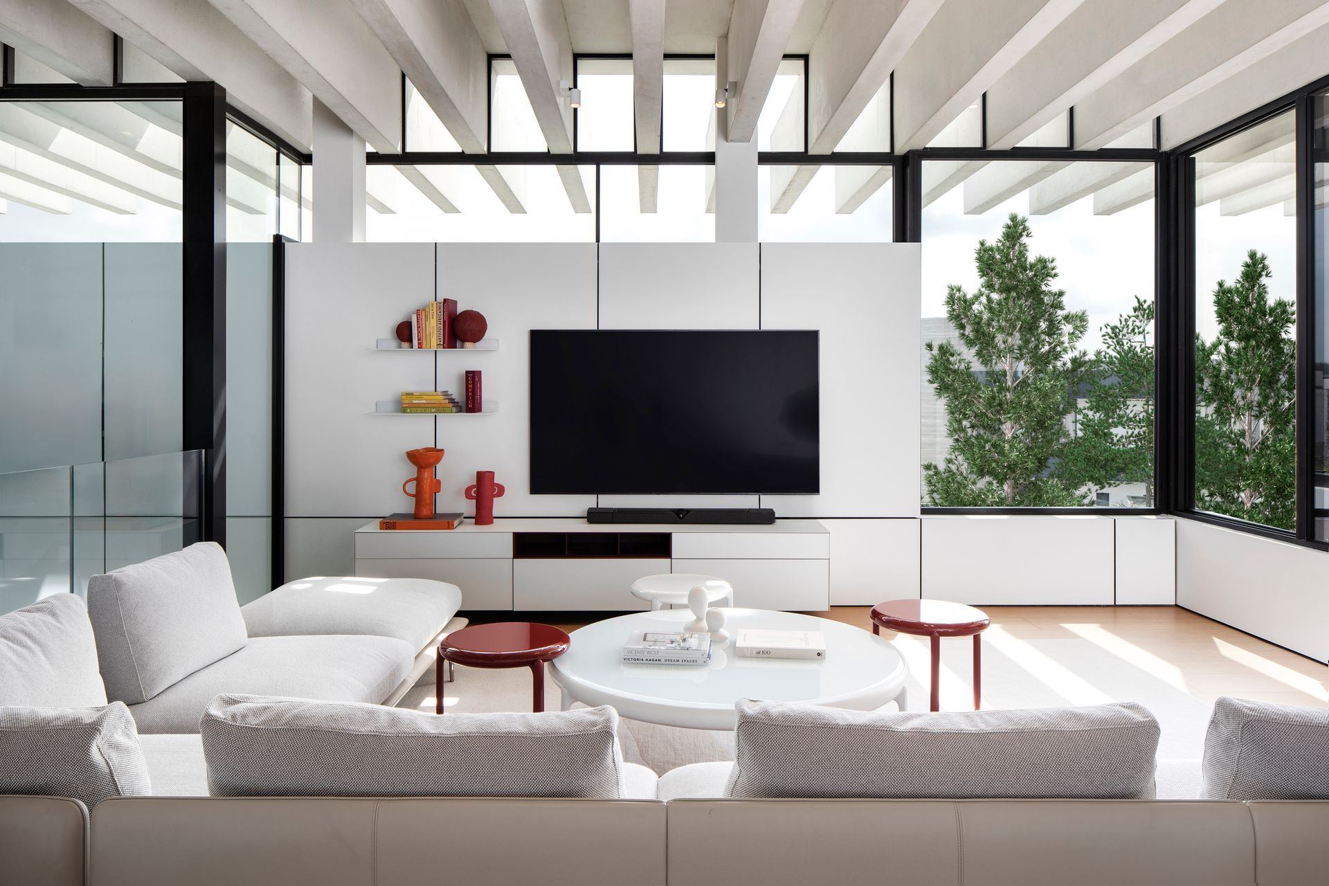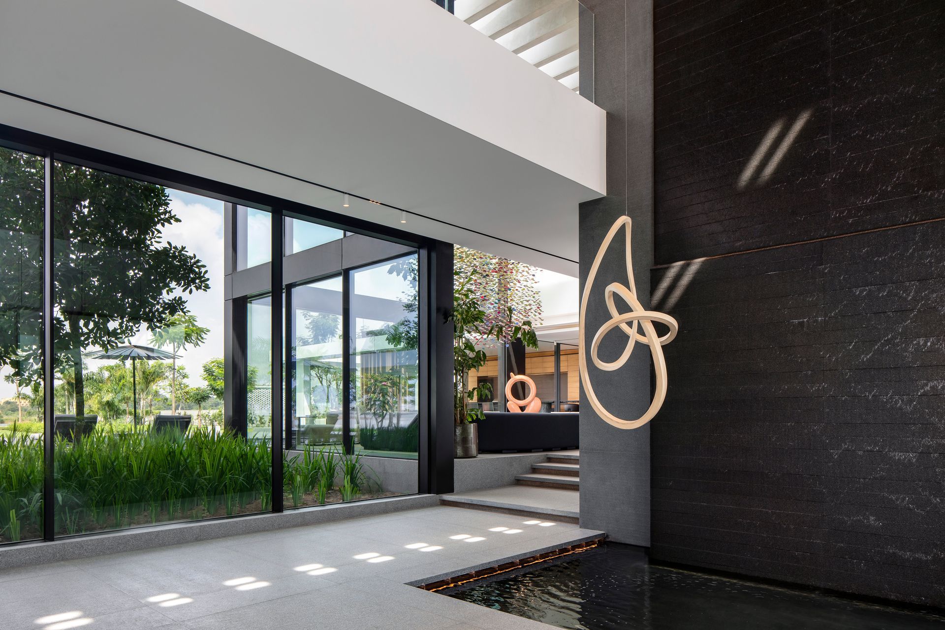 The design was heavily influenced by the client's desire to enhance the home's connection to the lagoon and its surrounding environment. Among its most distinctive features is the permeable roof, composed of concrete beams and skylights that allow natural light to sift through, mimicking the effect of sunlight filtering through tree leaves. This architectural feature, combined with the villa’s tiered courtyards, effectively softens the distinction between the villa’s interior and the outdoors, underscoring SAOTA’s commitment to integrating the landscape into their designs. Its setting in a park-like garden reinforces this integration.