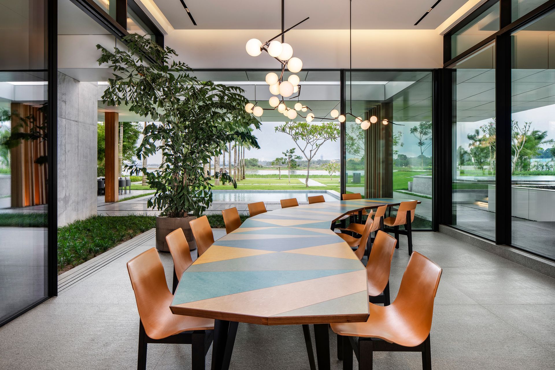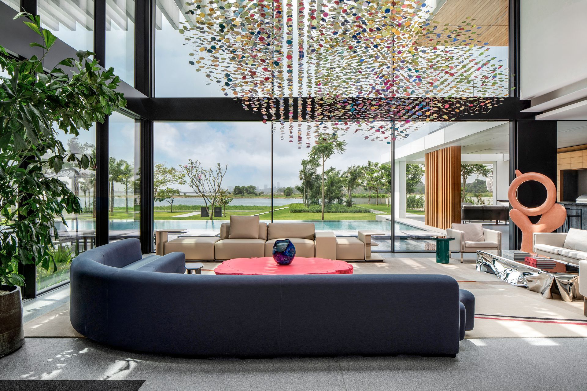 The design creates a unique dialogue between indoor and outdoor spaces, thanks to its innovative features like a permeable roof with skylights and tiered courtyards. These elements blur the lines between nature and living space, enhancing the home's connection to the lagoon and surrounding park-like garden.