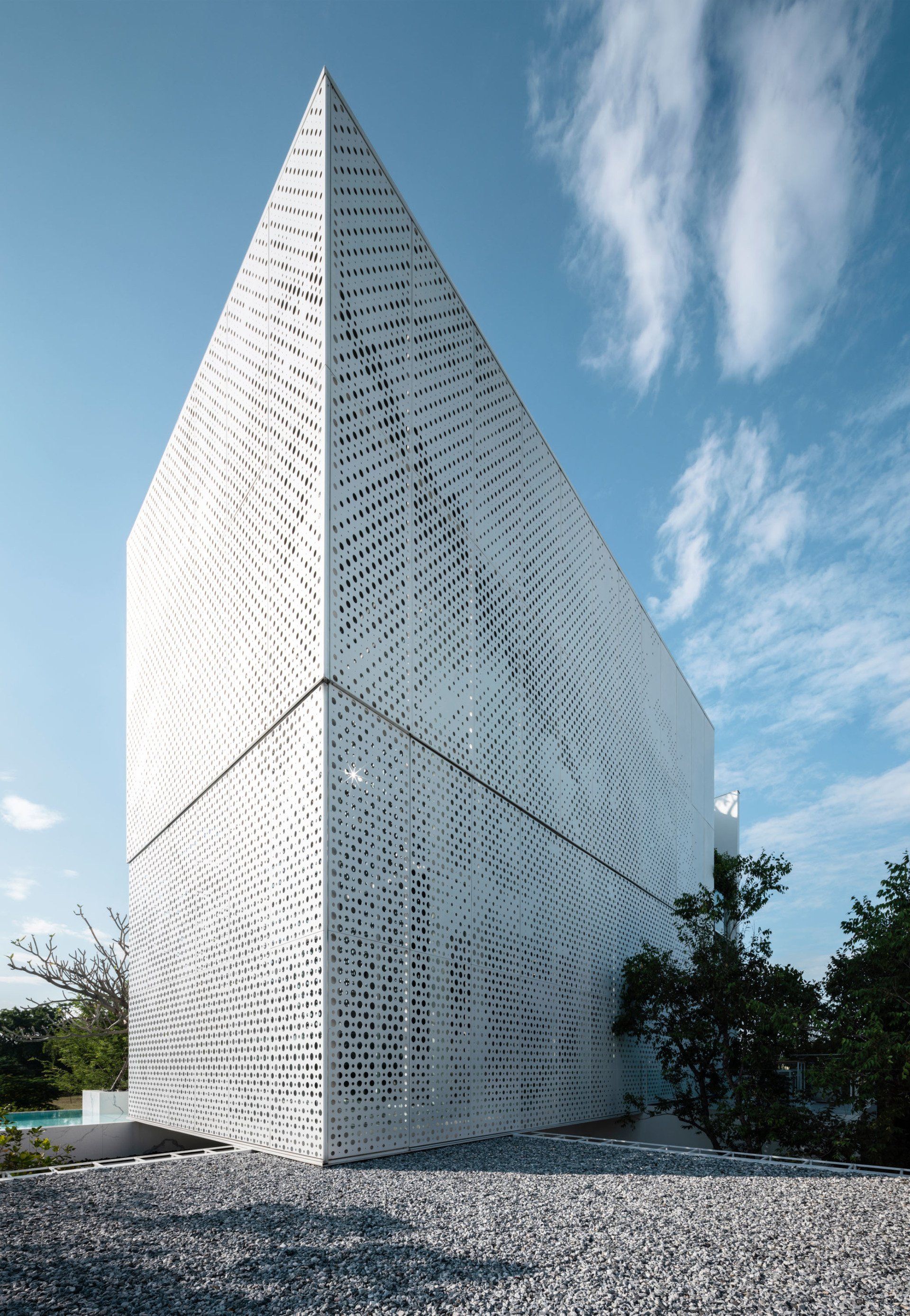 The graphic of the façade holes is creatively punched imitating to the overlaid tree leaves. During daytime, when the sunlight shines in the room, it will create the same effect similarly to sitting underneath the tree and absorbing the sunlight that shines through the leaf layers. The sizes of the holes are also determined accordingly to the usage of the function inside. For example, the holes of the living-room perforated facades are punched larger at the standing level and the couch-seating level, while the holes at the sleeping level inside the bedroom are punched smaller in order to secure privacy. At night, when the internal light shine through these holes, the living quarter will become a lantern, leading the way home. However, with AAd’s careful design, the outsiders will not be able to see what is inside due to the level of these holes punched.