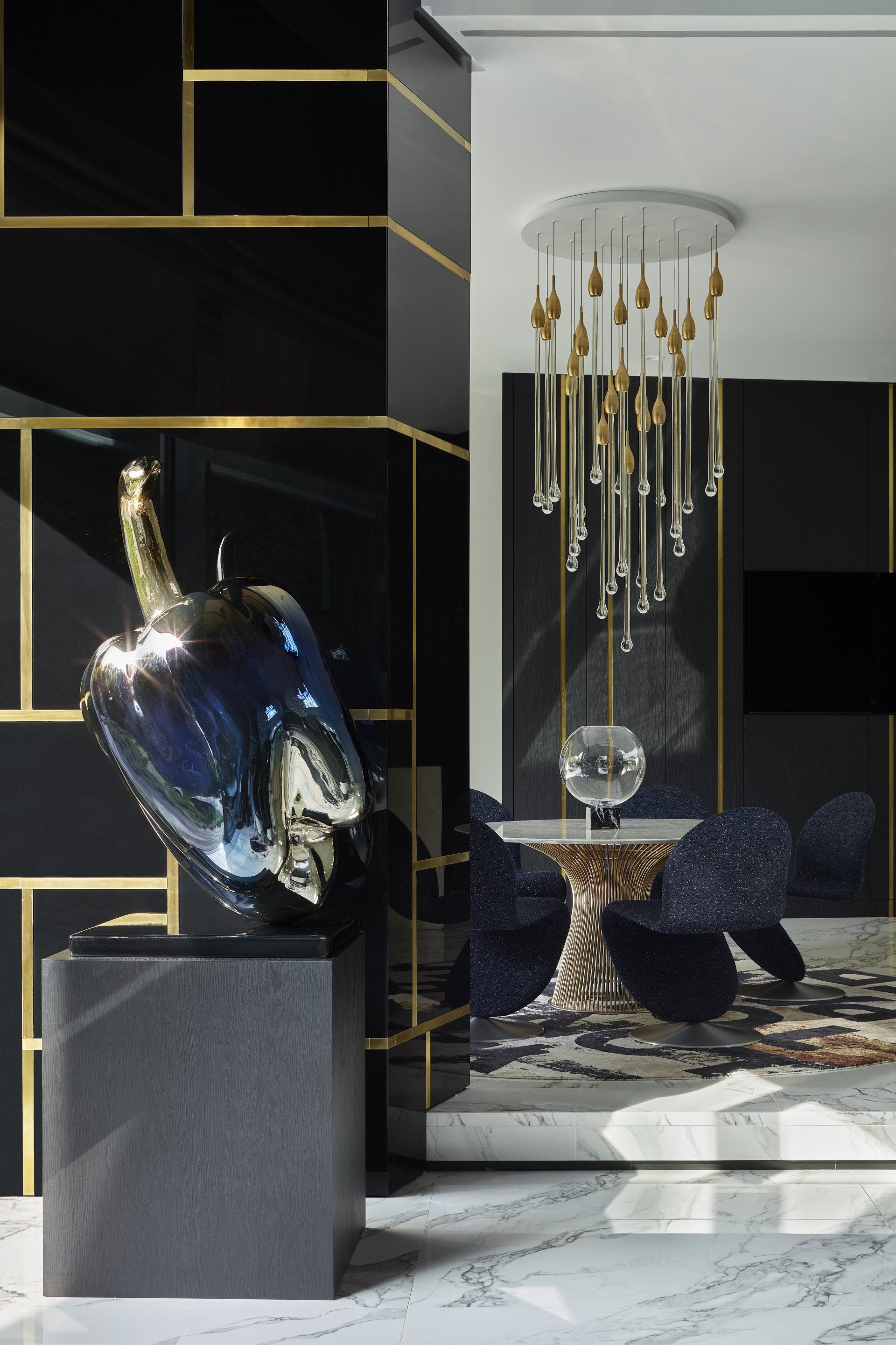 Inside, natural materials predominate, from exotic marbles, some backlit, to metal and timber surfaces that bring softness and warmth. ARRCC maintains a dialogue with the architecture in their interior design details. The television's metallic frame resonates with the ledge's faceted jewel-like form below it and the external brass buckle at the building entrance.