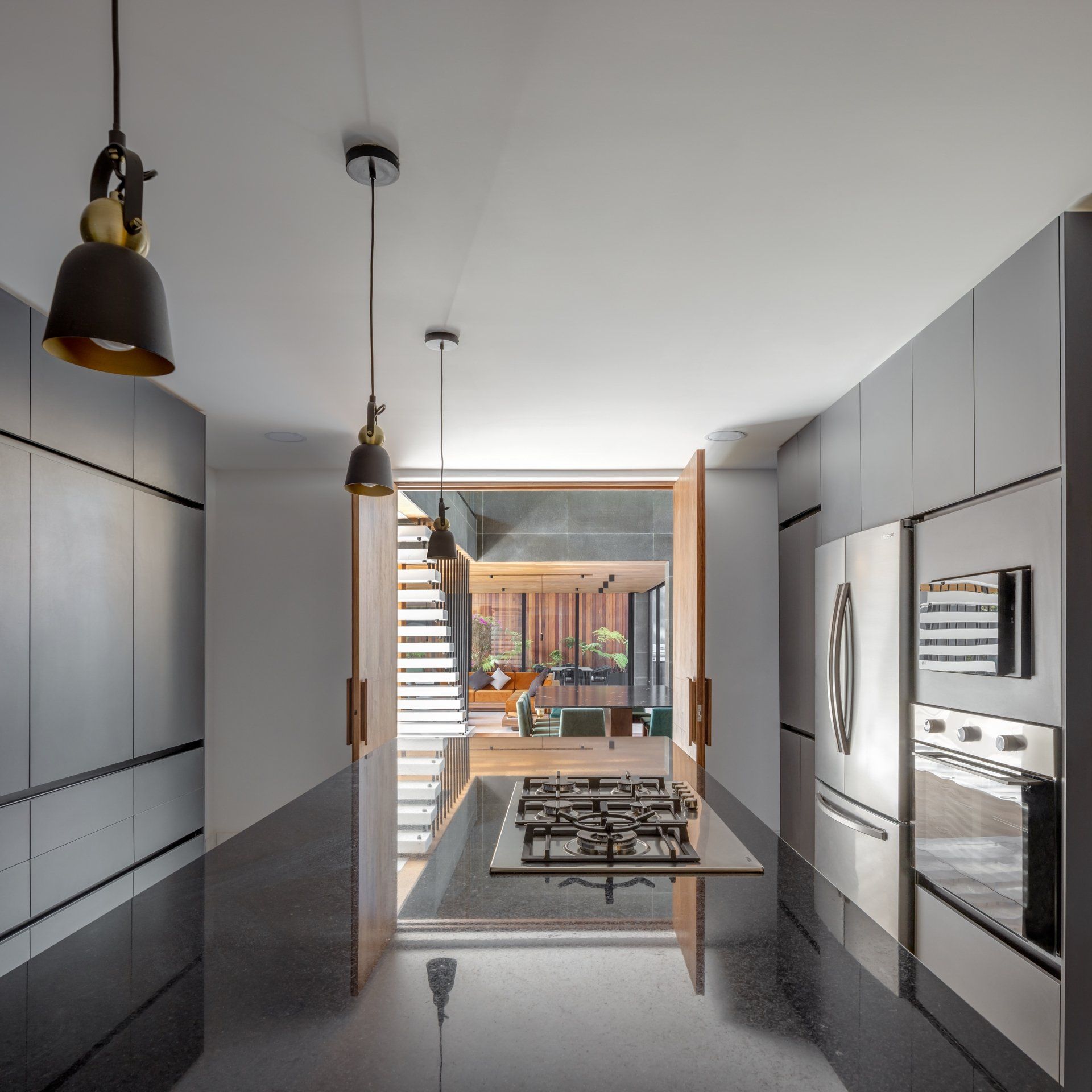 The house is oriented on an east-west axis and feature two stories. On the first floor are the living and service areas, including the entrance, garden, living room, dining room, terrace, TV room, kitchen, half-bath and maid's quarters. In the living room, the wood from the kitchen doors extends like a carpet and frames the dining room in a warmth that delineates it without the need for walls.