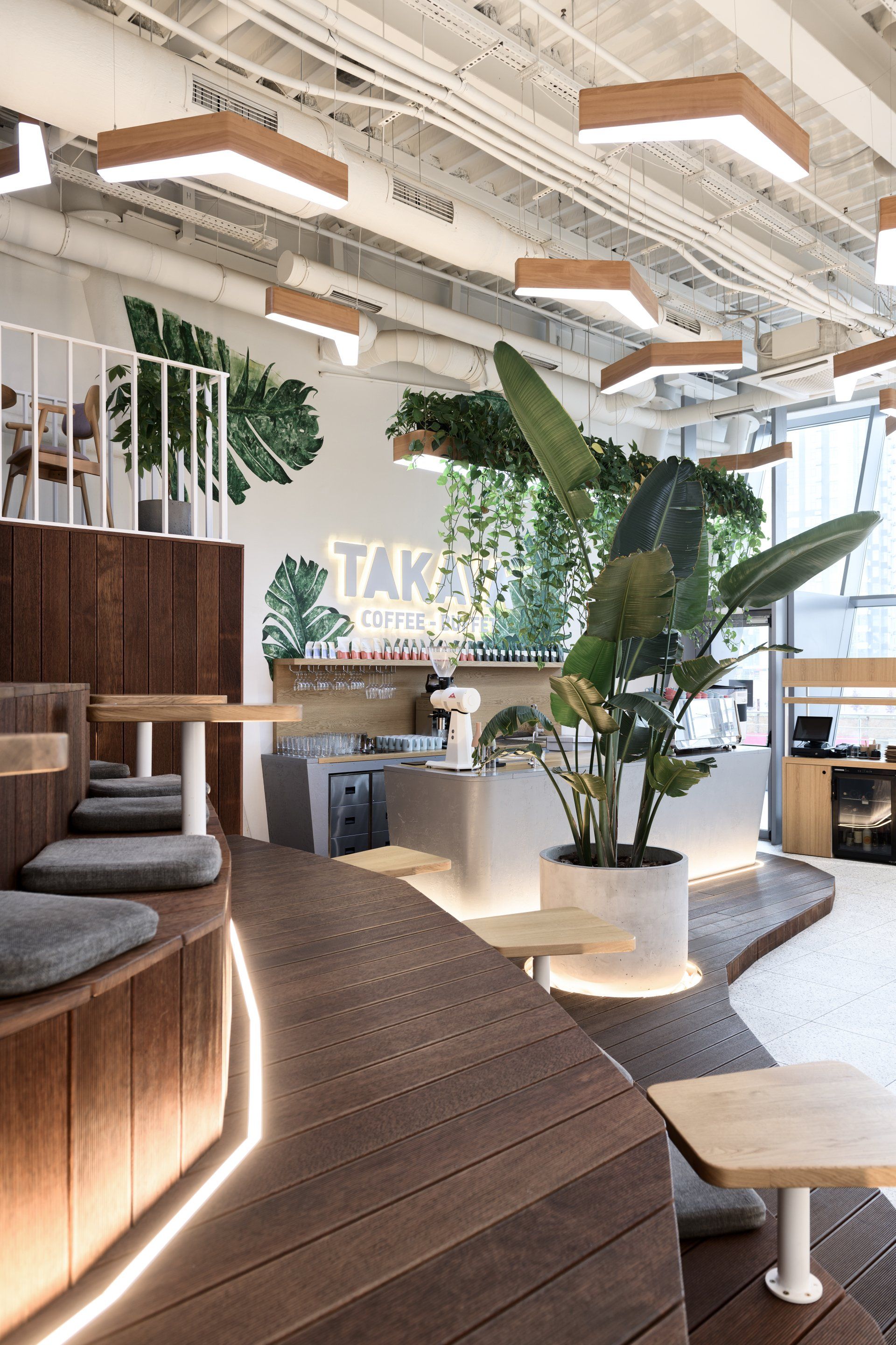 In 2021, when working on this Takava bar, the leaders of YUDIN Design, like all other architects around the world, worked on enriching locations with aesthetic impressions. Due to the travel limits caused by the effects of COVID, the owners and their visitors expected more from the interior: not only beauty, relevance and comfort - but also the opportunity to immerse themselves in a completely different atmosphere from the environment. So the idea arose to develop a Scandinavian design with a somewhat island theme for the coffee bar in the River Mall shopping center. In addition, this idea has a commercial connotation because it emphasizes the exotic map of the cafe - in this Takava you can order coffee drinks from selected beans coming from the most exotic parts of the world.