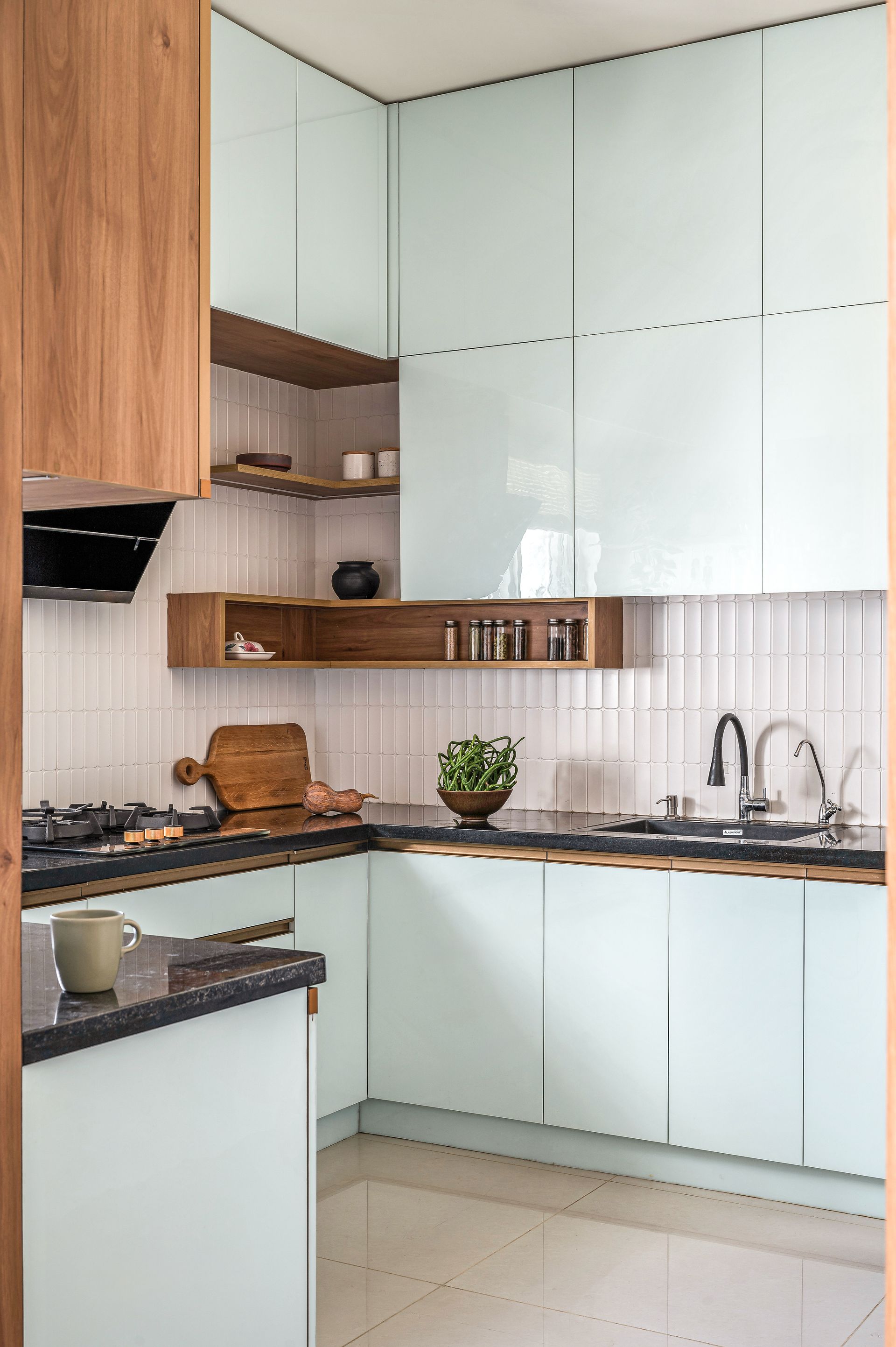 “This was the most challenging yet gratifying space to design. In addressing the space constraints, we deliberated on multiple configurations to efficiently utilize the area, and eventually settled on a meticulously arranged U-shaped set-up. Additionally, we chose light-colored hues with glossy acrylic finishes for the cabinets and the backsplash. These reflective surfaces enhance brightness, conjuring an atmosphere of spaciousness and rejuvenation.”