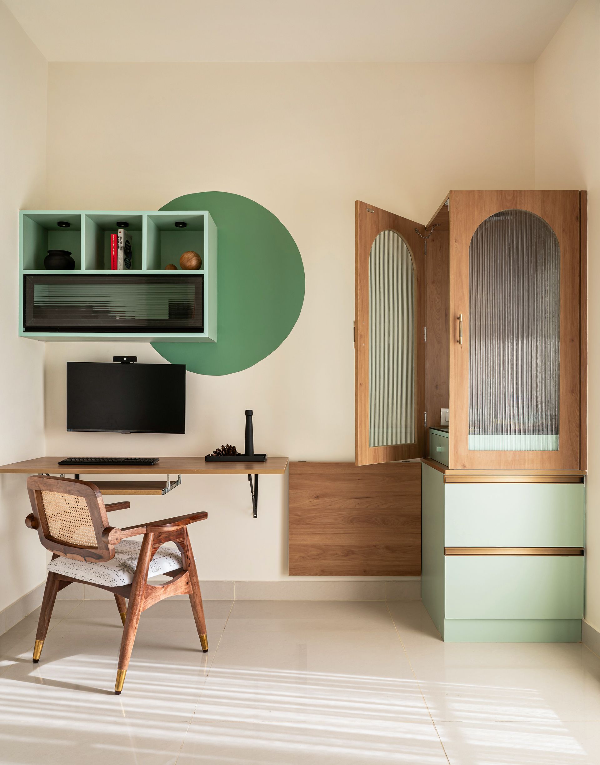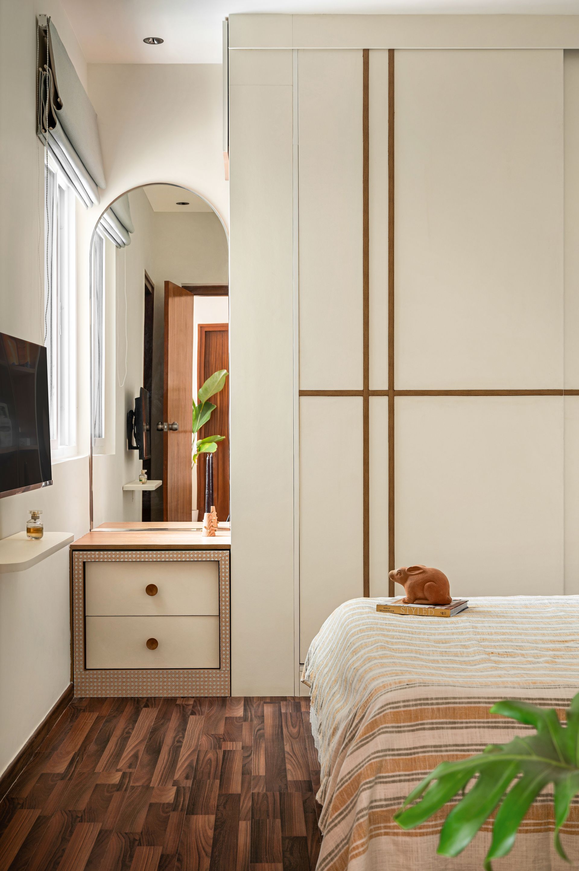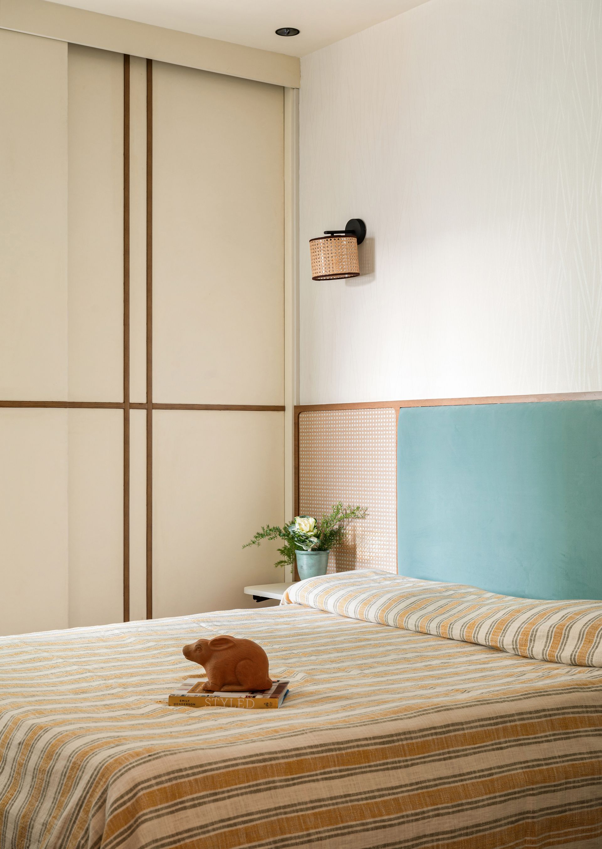 In the master bedroom, amidst the prevalence of rustic appeal with its mellow beige hues and natural materials, vivaciousness bursts forth with the mint blue headboard, injecting a lively contrast. Mirroring the earthiness of the living area, wood and cane make a reappearance in the furniture pieces and wall sconces. In the space between the bed and the wardrobe, the design team installed a fold-down ledge that serves as a stand for the former and offers convenient access to the latter when lowered. Below the dresser mirror, we adeptly integrated a unified ensemble, featuring a pouffe with a hollow centre intentionally scooped out to create space for the drawers.