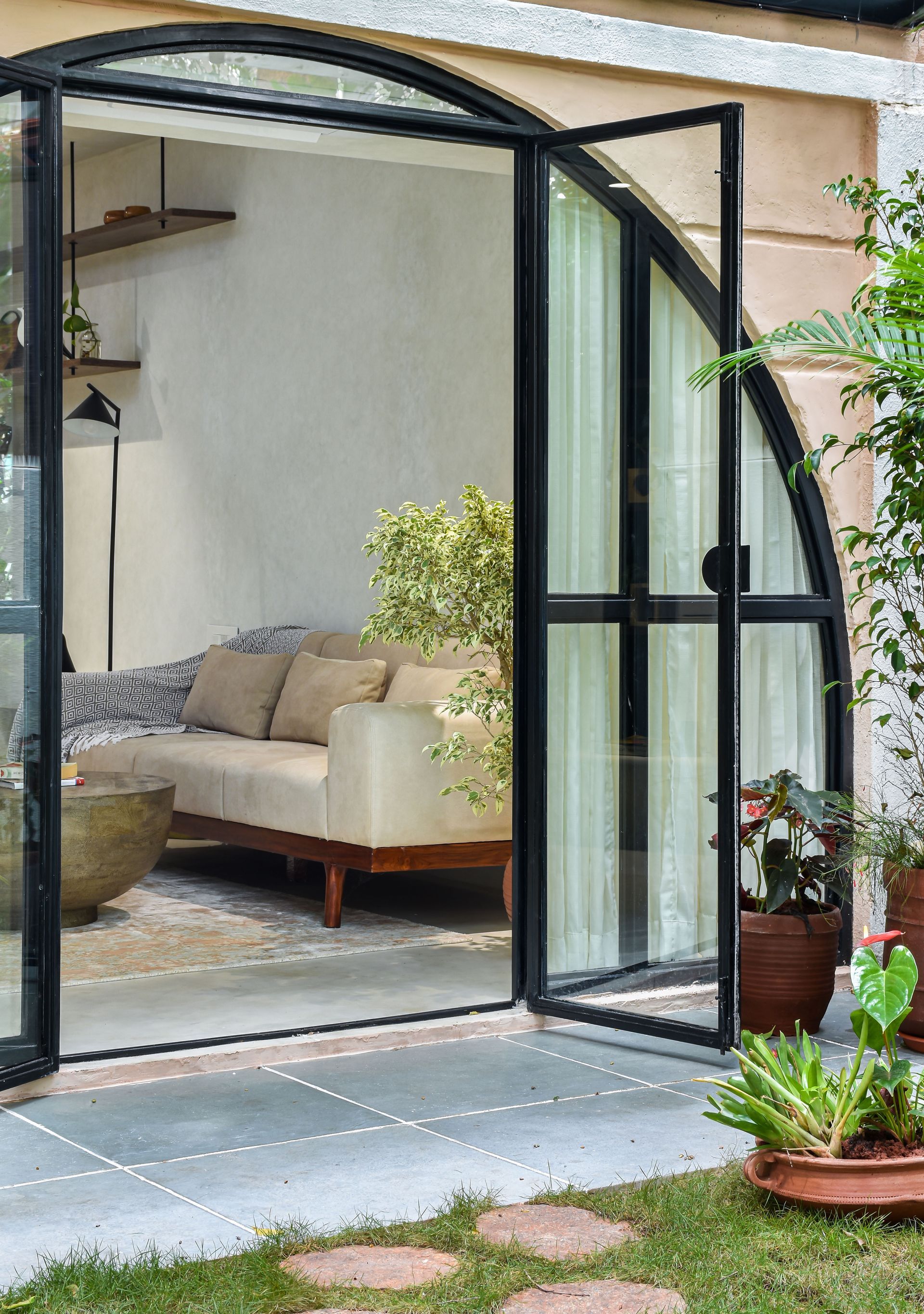 The living room opens up entirely onto the garden area through an arched doorway thus bringing the outside in. The idea here is to create a fine harmony between the indoor and the outdoor as one unified space. The whole living space has been designed so as to keep the outdoor as the main focal element.