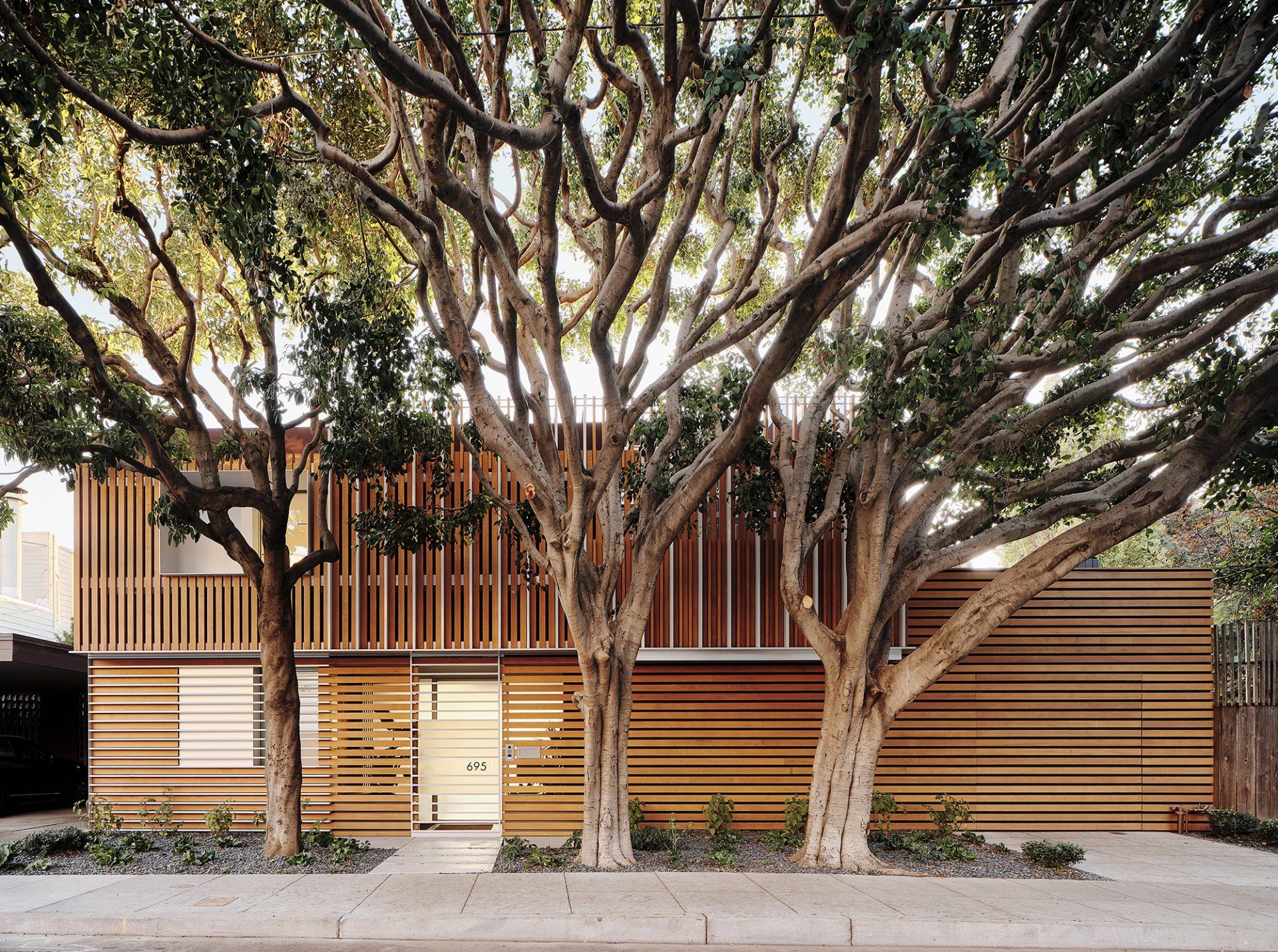 A front facade composed vertical and horizontal wood boards and slats, echoes the trellises and partitions, tying together the home’s public and private expressions and replacing an opaque street presence with a wood screen activated by shifting light from day to night.