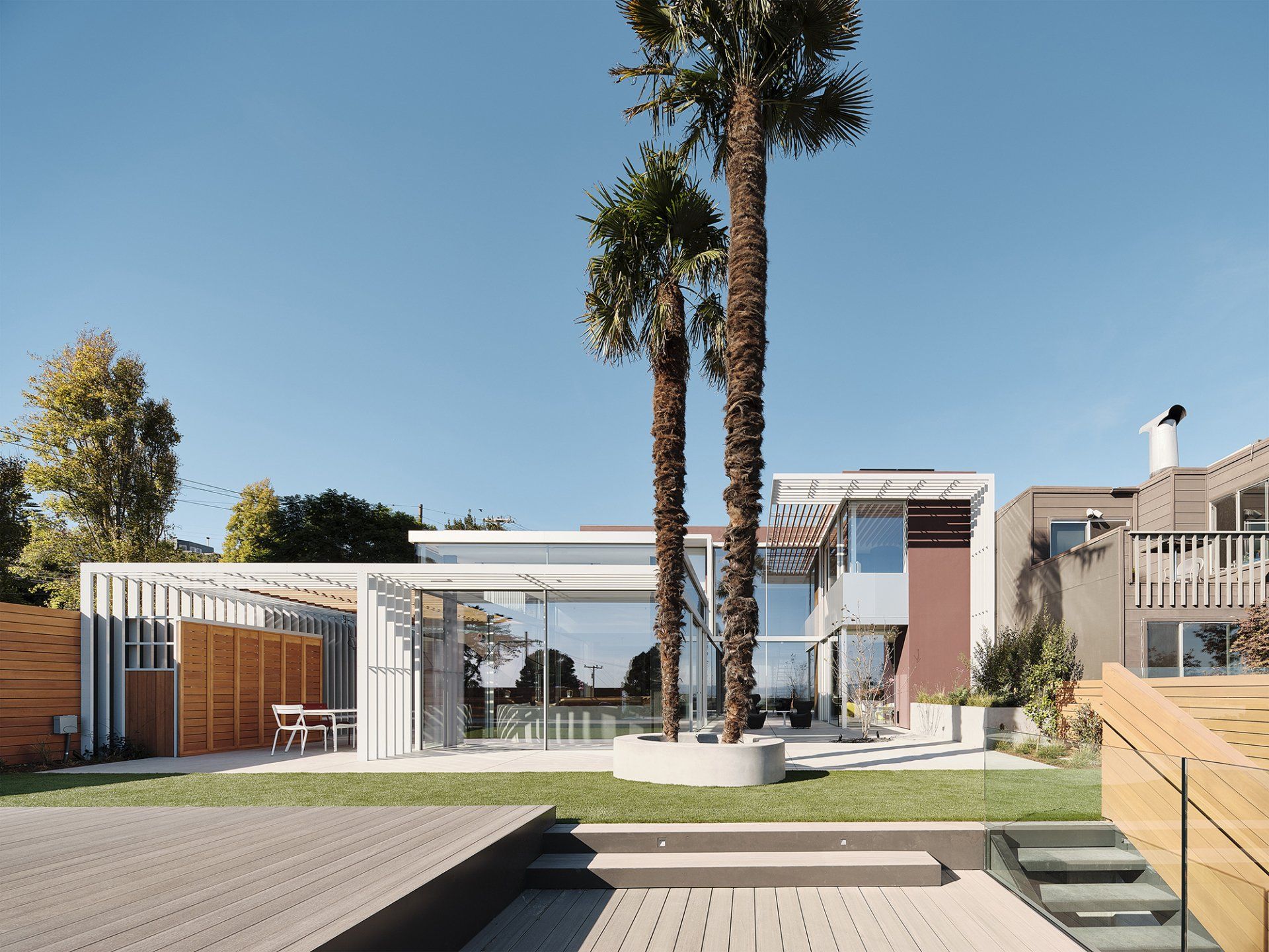 Here, we can see the most visible intervention - the insertion of an all-glass pavilion enclosing a dining and family room. Neither completely indoors nor outdoors, this volume reaches into the rear yard to engage sweeping views of the bay and East Bay hills beyond. Trellis of aluminum and wood shade the space without encumbering the sense of expansiveness.