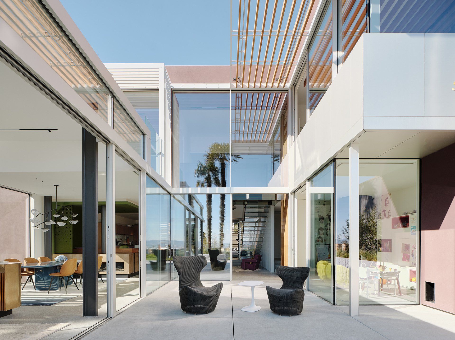 Throughout the house curved forms and playful elements—including a child’s fire pole connecting the two floors - counter the home’s rectilinear form.