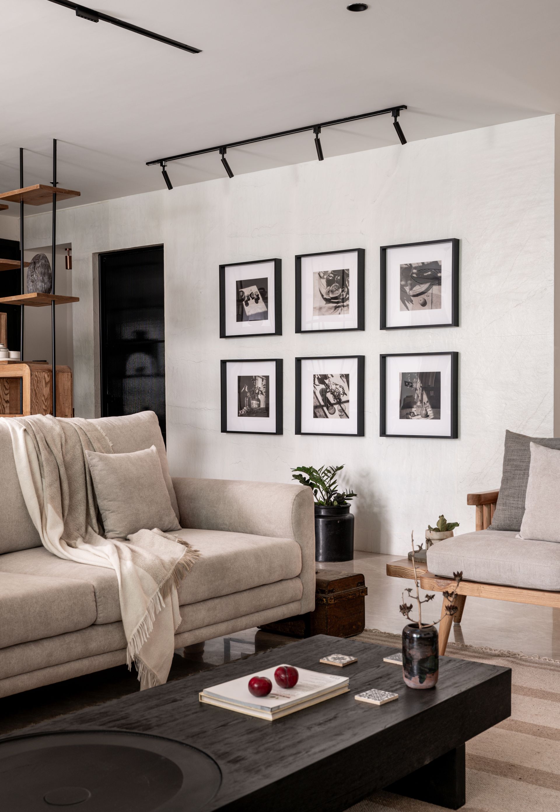 Entering the apartment, one is drawn into the gallery-esque foyer, which likens itself to a connective spine, branching into various nodes of the home. Flanking one edge is a metal and wood stratified partition system with curated bric-a-brac. This feature is a veil of sorts, endowing the communal areas it faces with a layer of privacy. Half a dozen greyscale prints form a collage, creating a subtle focal point.