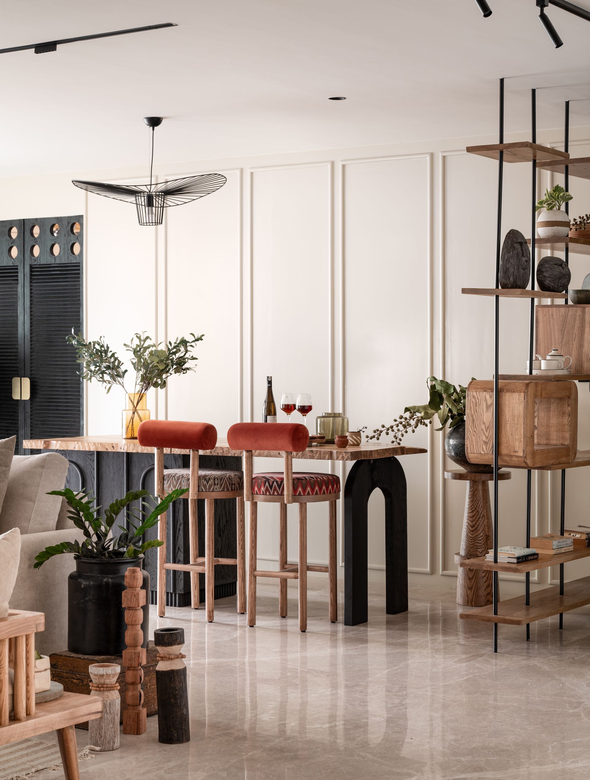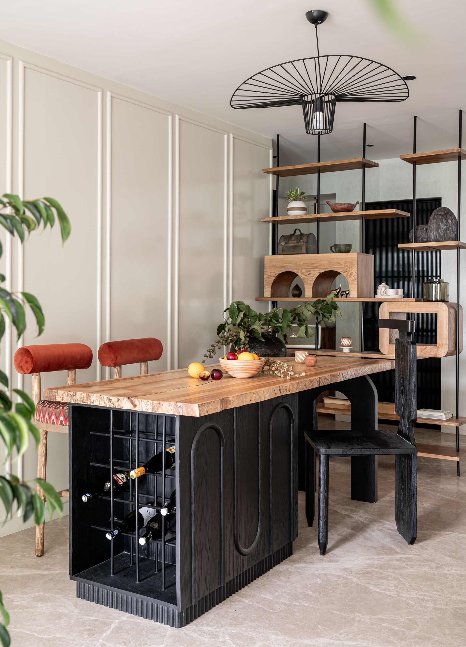 Merging with an adjoining bar island, the formal living is designed to amplify the perception of space, especially when hosting intimate gatherings. A live-edge countertop crowns the black elm wood base, the latter resembling a sculptural insert with its curved form and sinuous mouldings. An exposed wine rack along one edge introduces elevated functionality, making the in-house collection’s perusal seamless! The eclectically-upholstered bar stools administer a strong dose of a rust hue and Aztec patterns, riffing off the monotoned demeanour of the space.