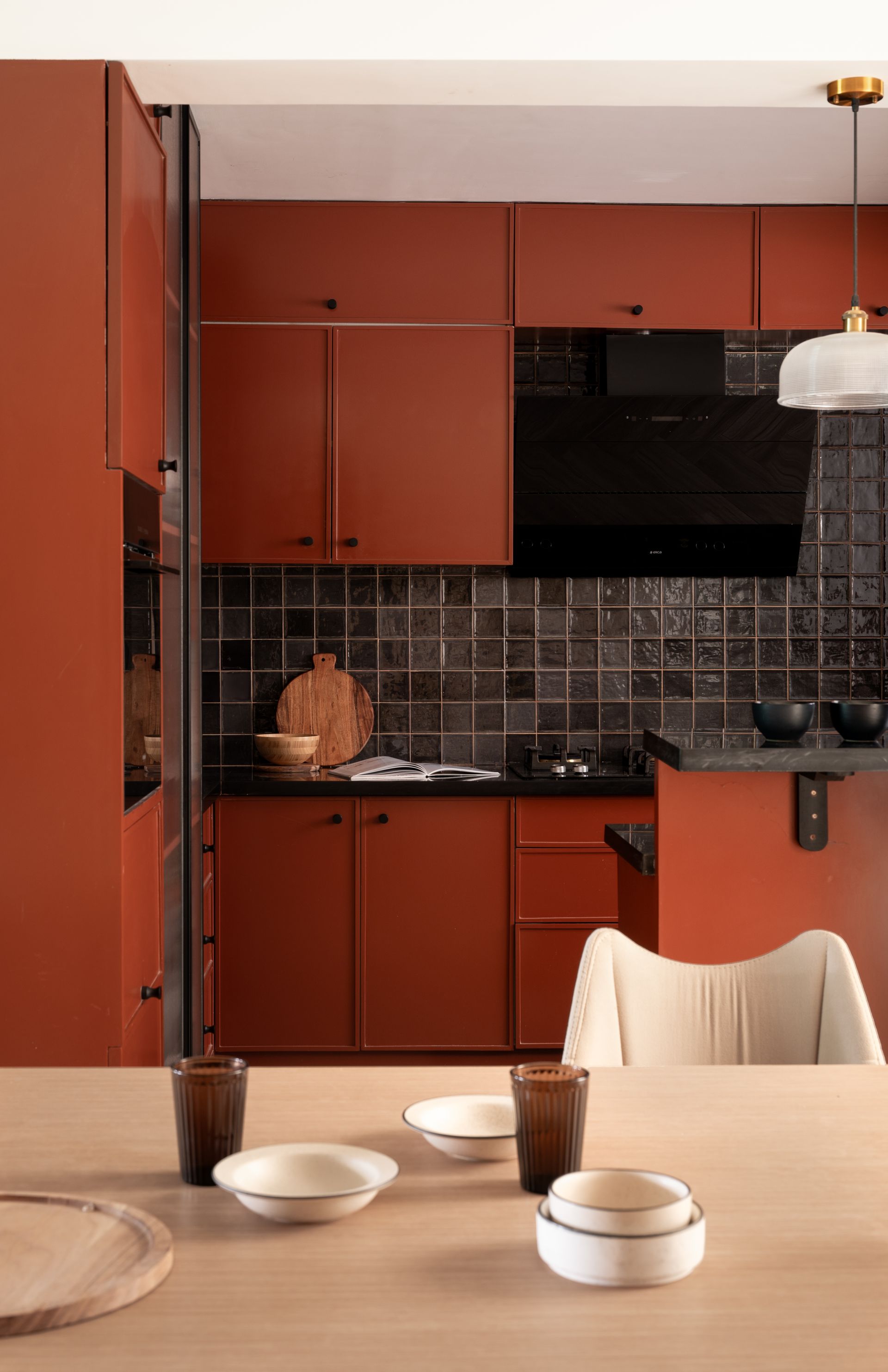 A microcosm of rich colours and dramatic imagery, the kitchen exhibits alchemy between terracotta millwork and a lattice of lustrous, ebony backsplash tiles.