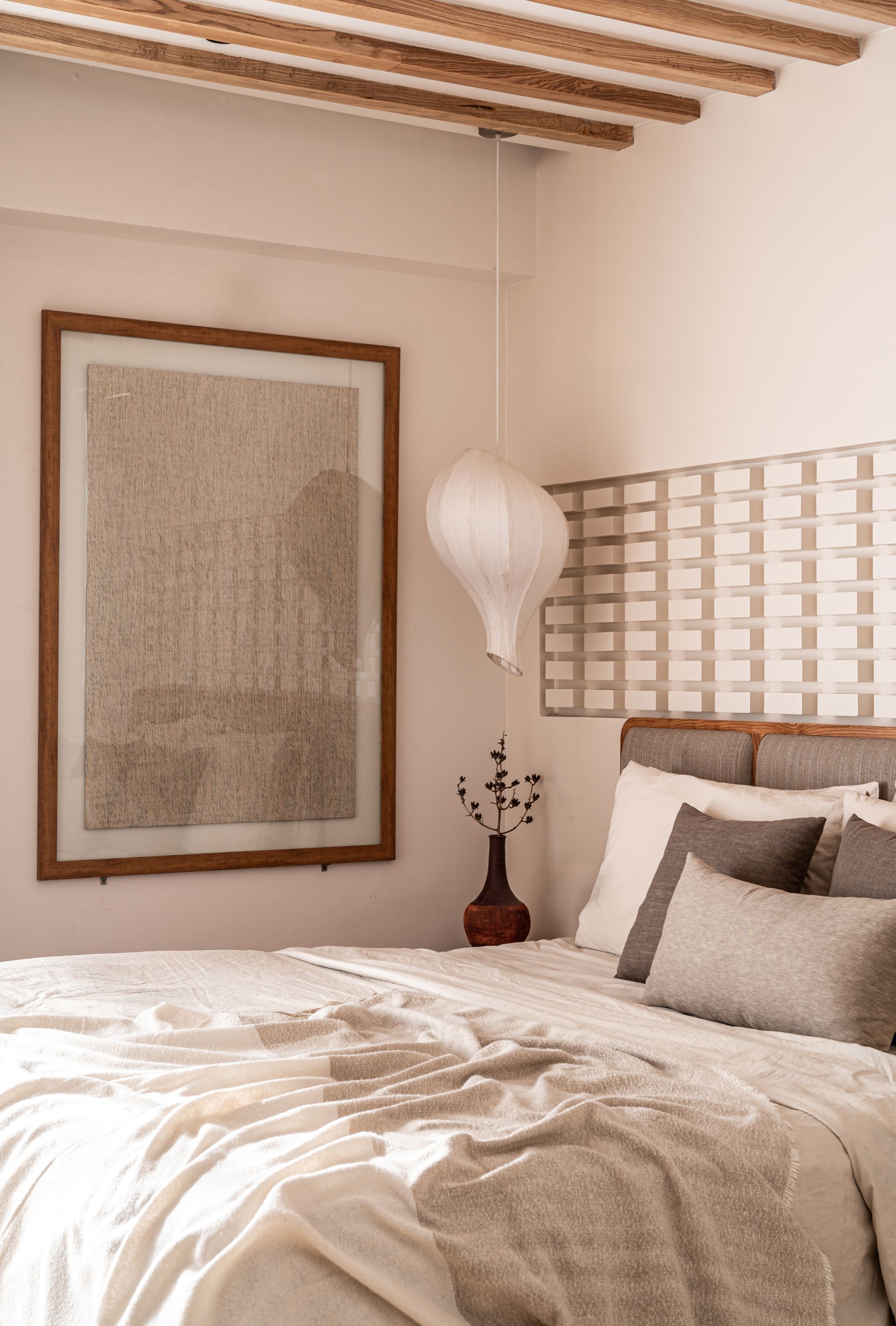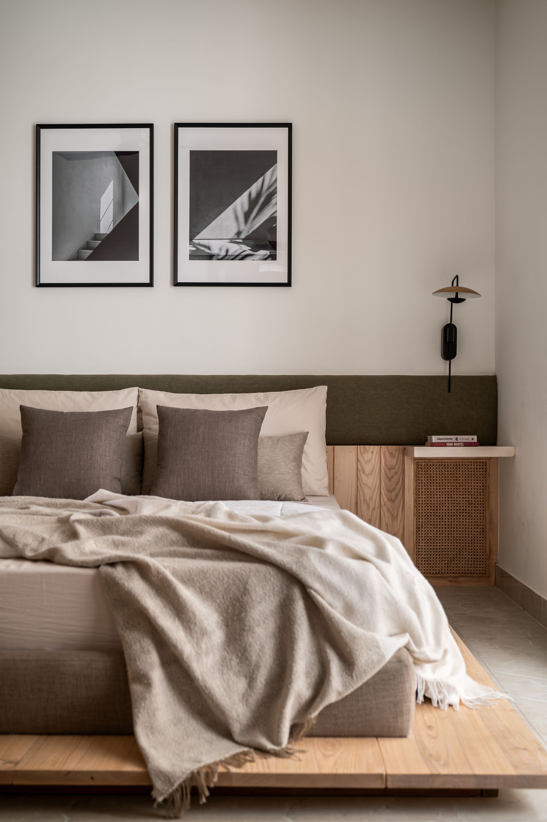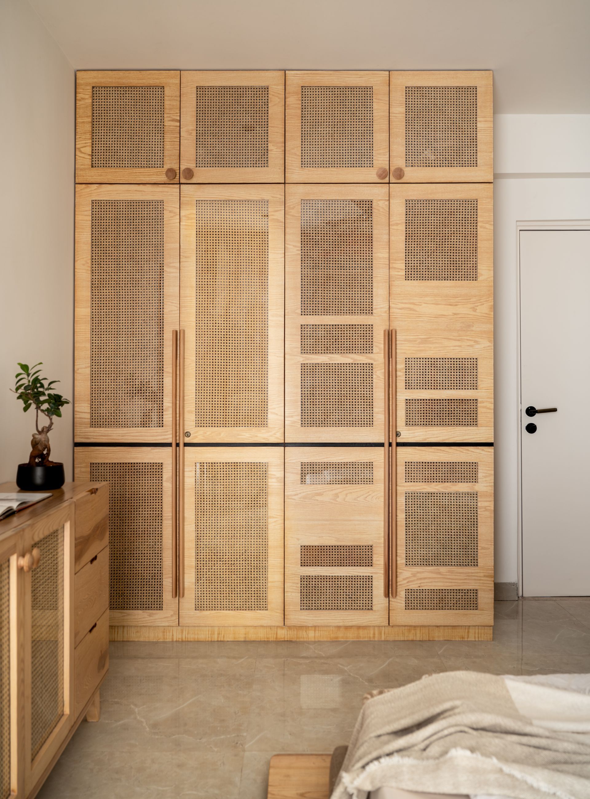 Embedding tactile warmth amid modernism, the guest bedroom fondly hosts the family’s loved ones. The eggshell-hued room celebrates the union of muted colours, natural materials, and resilient textures, bolstering the narrative that courses through the apartment. A platform-style light wood bed dominates the scene, its slender olive headboard posing as the harbinger of colour. Below, slatted wood and segments of cane create projecting nightstands, incorporating playful texture into the blend.