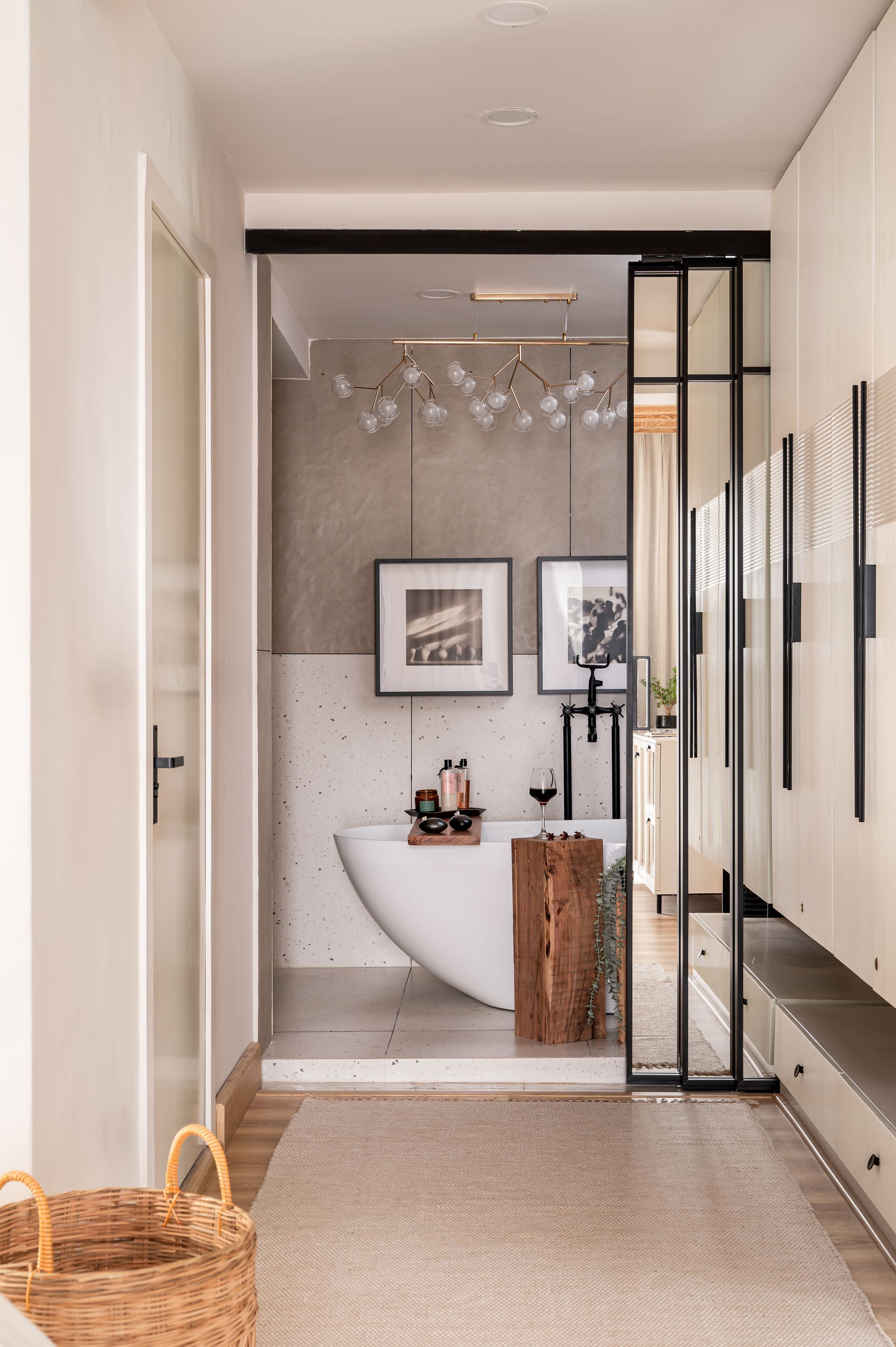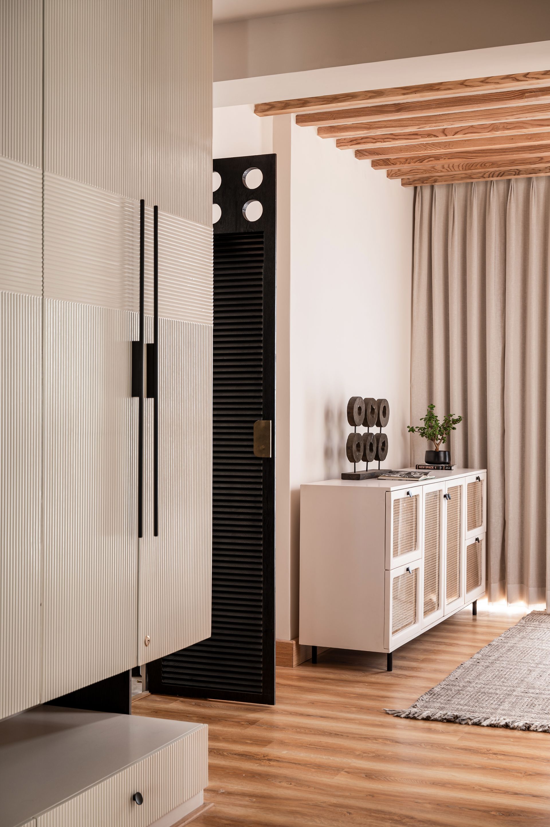 Grounding its inhabitants in a caress of zen, the master suite bears a filmic quality of tranquillity that verges on ethereal. The room rests behind the sheltering clasp of a black elm double door. Its charcoal hue commands attention, bashfully guarding the refuge it holds within. Details like the crown of circles overhead, the louvred slats for privacy, and the sleek brass hardware grant the door an installation-like identity.